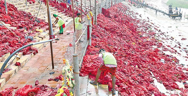 దీక్ష విరమణ కోసం రాష్ట్రం నలుమూలల నుంచి విజయవాడ కనకదుర్గమ్మ దేవాలయానికి వేలాదిగా వస్తున్న భవానీలు పరిసరాలు శుభ్రంగాలేక ఇబ్బంది పడుతున్నారు. సమ్మె నేపథ్యంలో పారిశుద్ధ్య పనులకు కార్మికులెవరూ రావడం లేదు. దీంతో ఆలయ పరిసరాలు, కనకదుర్గానగర్, కృష్ణవేణి ఘాట్, కల్యాణకట్ట పరిసరాలన్నీ అపరిశుభ్రంగా మారాయి. భవానీలు ఇరుముడులు దించే ప్రదేశంలో చెత్త పేరుకుపోయింది. పవిత్రమైన ఇరుముడి బియ్యాన్ని నేలపై తొక్కుతున్నారు. భవానీలు స్నానాలు చేసే కృష్ణవేణి ఘాట్ పరిసరాలు దుర్వాసన వస్తున్నాయి. తలనీలాలు, భవానీలు విడిచిన దుస్తులన్నీ ఘాట్ మెట్లపై కుప్పలుగా పడిఉన్నాయి. అందరూ వాటిని తొక్కుకుంటూ వెళ్లి జల్లుస్నానాలు చేసి రావాల్సిన దుస్థితి నెలకొంది. ఆలయ అధికారులు వెంటనే స్పందించి దుర్గగుడి పరిసరాలను పరిశుభ్రంగా చేయించాలని భక్తులు కోరుతున్నారు.