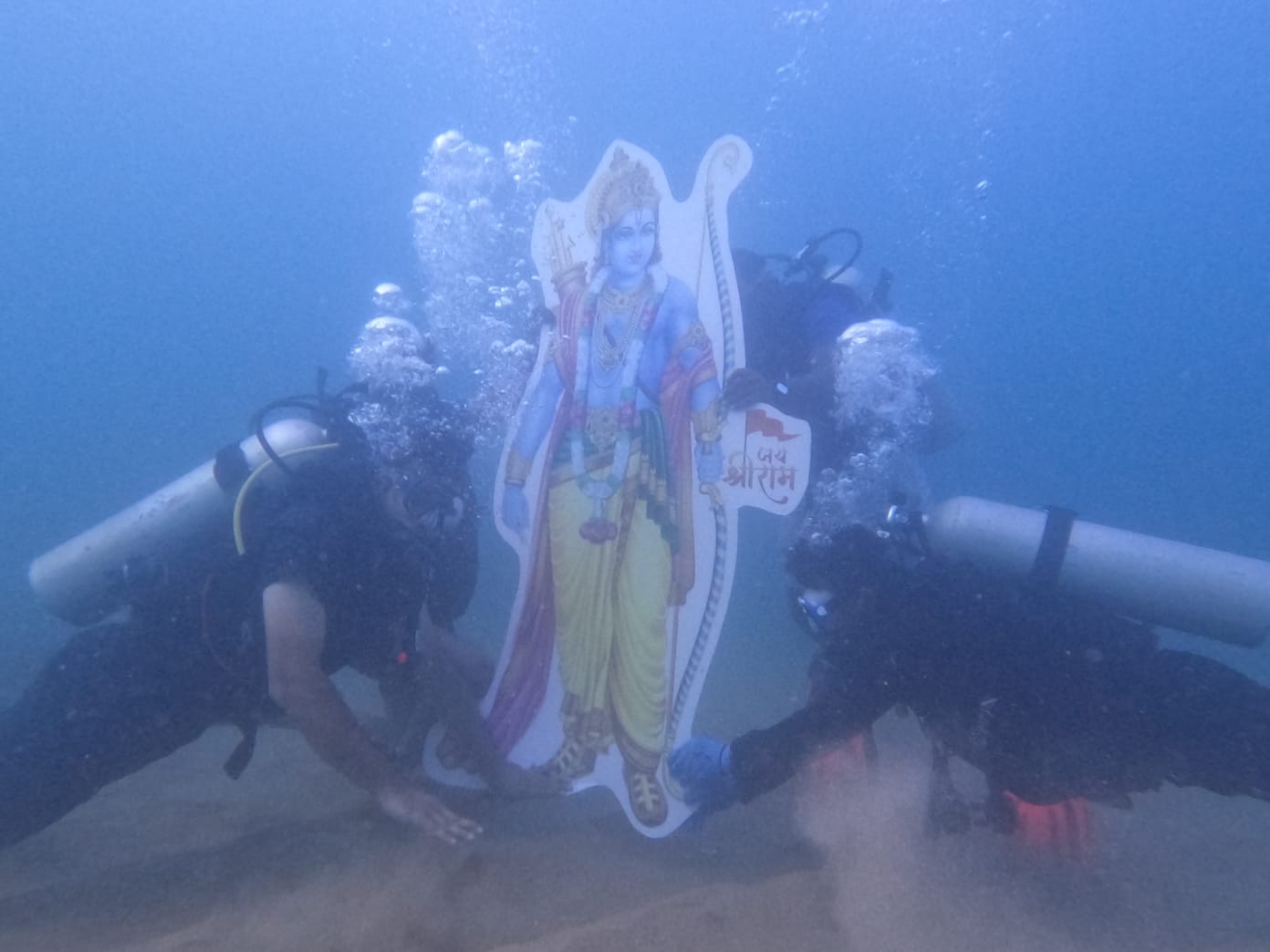 అయోధ్యలోని బాలరాముని ప్రాణప్రతిష్ఠా మహోత్సవం జరిగితే విశాఖకు చెందిన స్కూబో డైవర్లు తమ దైన రీతిలో భక్తిని చాటుకున్నారు.విశాఖపట్నంలోని రుషికొండ సముద్ర గర్భంలో నిలువెత్తు శ్రీరాముని రూపాన్ని నీటి అడుగువరకూ తీసుకువెళ్లి అక్కడ ప్రతిష్టించి ఆరాధించారు. 22 అడుగుల లోతులో ఈ కార్యక్రమం జరిగింది.లైవ్ ఇన్ అడ్వెంచర్స్కు చెందిన డైవర్లు ఈ సాహసం కృత్యం చేశారు.తమ ఈ ప్రయత్నాన్ని ప్రజలందరూ స్వాగతించి సాగర శ్రీరాముడిని దర్శించుకోవాలంటూ వీడియోలను విడుదల చేశారు.