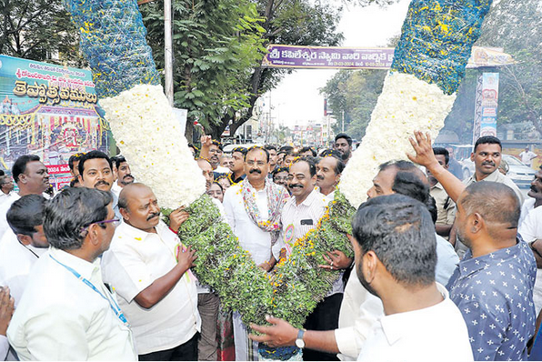 తిరుపతిలో స్వామి సేవలో తరలించాల్సిన టీటీడీ ఉద్యోగుల్లో కొందరు సంస్థ ఛైర్మన్ సేవలో పునీతమవుతున్నారు. ఆయన అడుగులకు మడుగులొత్తుతూ.. పూలు చల్లుతూ.. మంగళ వాయిద్యాలు వాయిస్తూ.. రాజకీయ పార్టీ రంగుల పూలమాలలతో ఆహ్వానం పలకడం విశేషం. స్వామికి సేవ చేయాల్సిన ఉద్యోగులు ఇలా చేయడంపై ‘ఇదేమి వైపరీత్యం శ్రీనివాసా.. గోవిందనామాలు వినిపించాల్సిన ప్రదేశంలో ఈ వ్యక్తి జపం ఏమిటంటూ భక్తులు బుగ్గలు నొక్కుకుంటున్నారు. శుక్రవారం తిరుపతిలోని తితిదే పరిపాలన భవనంలో ఛైర్మన్, ఎమ్మెల్యే కరుణాకర్రెడ్డికి ఉద్యోగులు ఇలా ఆత్మీయ సన్మానం నిర్వహించి పులకించారు.