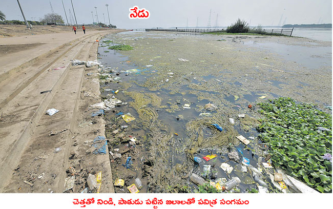 వేద మంత్రోచ్చరణలతో మార్మోగిన ప్రాంతమది. భక్తులు, సందర్శ కులు పవిత్ర సంగమంలో స్నానాలు ఆచరించి, పంచ హారతులు అందుకొన్న పుణ్య స్థలం నేడు.. చెత్తతో నిండిపోయింది. పవిత్ర సంగమంలో పాకుడు దర్శనమిస్తోంది. ఘాట్లలో మద్యం సీసాలు కని పిస్తున్నాయి. ఎన్టీఆర్ జిల్లా ఇబ్రహీంపట్నం ఫెర్రీ వద్ద గోదావరి, కృష్ణా సంగమం ప్రదేశం ఉంది. ఇక్కడి నుంచి గతంలో నదులకు నిత్యం పంచహారతులు ఇచ్చేవారు. చూసేందుకు భక్తులు, సందర్శకులు వచ్చేవారు.కానీ ఇప్పుడు ఆ పంచహారతులు బంద్ అయ్యాయి. ఈ ప్రదేశం అసాంఘిక కార్యకలాపాలకు అడ్డాగా మారింది. నిర్వహణ లేకపోవడంతో ఘాట్లు దెబ్బతిన్నాయి. ఎక్కడ చూసినా మద్యం సీసాలే దర్శనమిస్తున్నాయి.