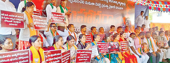 పశ్చిమ బెంగాల్ తృణమూల్‌ కాంగ్రెస్‌ నాయకులు చేస్తున్న దమనకాండకు బాధ్యత వహిస్తూ ముఖ్యమంత్రి మమతా బెనర్జీ రాజీనామా చేయాలని బీజేపీ రాష్ట్ర అధికార ప్రతినిధి సాదినేని యామినీ శర్మ డిమాండ్‌ చేశారు. పశ్చిమ బెంగాల్‌లో రాష్ట్రపతి పాలన విధించి, నిందితులను తక్షణమే అరెస్టు చేయాలని కోరారు. ఈ విషయమై శనివారం విజయవాడ ధర్నాచౌక్‌లో బీజేపీ మహాధర్నా చేపట్టింది. దీనికి ఆమె ముఖ్యఅతిథిగా విచ్చేసి మాట్లాడారు. మోదీ ప్రభుత్వం మహిళలకు అన్ని రంగాల్లో 33 శాతం రిజర్వేషన్‌ కల్పించడమే కాకుండా.. ఒక గిరిజన మహిళను రాష్ట్రపతి చేశారని తెలిపారు. పశ్చిమ బెంగాల్‌ల్లో తృణమూల్‌ కాంగ్రెస్‌ నేతలు మహిళలపై అత్యాచారాలకు పాల్పడుతున్నారని ఆరోపించారు. సందేశ్‌ ఖాలీలో జరిగిన దురంతాలే దీనికి ఉదాహరణ అని అన్నారు. జాతీయ మానవ హక్కుల సంఘం జోక్యం చేసుకున్న తర్వాతే కేసు నమోదు చేసి నిందితుడు షాజహాన్‌ను అరెస్టు చేశారన్నారు. తృణమూల్‌ కాంగ్రెస్‌ పాలనలో ఎస్సీ, ఎస్టీ, మైనార్టీ మహిళలకు రక్షణ లేకుండా పోయిందని విమర్శించారు. మమత అండ చూసుకుని నేతలు రూ.లక్షల కోట్లు సంపాదించారని ఆగ్రహం వ్యక్తం చేశారు. కశ్మీర్‌ ఫైల్స్‌, రజాకర్ల ఫైల్స్‌ చూశామని.. ఇప్పుడు బెంగాల్‌ ఫైల్స్‌ చూస్తున్నామని వ్యాఖ్యానించారు. మమతా బెనర్జీ మహిళ అయి ఉండి.. మహిళలపై దాడులు జరుగుతున్నా పట్టించుకోకుండా ఊరుకున్నారని ఆగ్రహం వ్యక్తం చేశారు. ఆమెకు ముఖ్యమంత్రిగా కొనసాగే హక్కు లేదని, తక్షణం రాజీనామా చేయాలని డిమాండ్‌ చేశారు. మహిళలపై అకృత్యాలకు పాల్పడే వారిని ఉరితీయాలని, ముఖ్యమంత్రి మమతా బెనర్జీని బర్తరఫ్‌ చేసి.. రాష్ట్రపతి పాలన పెట్టాలని కోరారు.