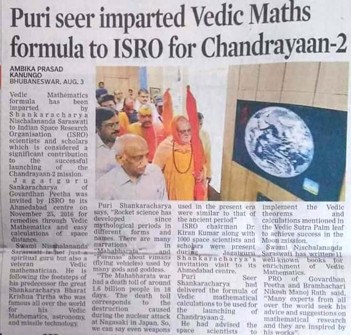 “అబ్బే, ఏమాత్రం నమ్మేట్టుగా లేదు, ఉత్త ఫేక్” అని కొట్టేసేవాళ్లు బోలెడు మంది ఉంటారు కదా ఈ వార్తను? కానీ ఈ వార్త నిజమే. కాకపోతే మన మెయిన్ స్ట్రీమ్ మీడియాకు ఇలాంటివి పట్టవు. అయితే ఇక్కడ గమనించాల్సిన అంశాలు కొన్ని ఉన్నాయ్. ఈ స్వామి పూరి శంకరాచార్య నంబర్ 145. ఈయన 143వ శంకరాచార్య శ్రీ భారతీ కృష్ణ తీర్థకు ప్రియమైన శిష్యుడు. శ్రీ భారతీ కృష్ణ తీర్థ వేదగణితంలో దిట్ట. ఆధునిక గణితం వల్ల కాని అనేకానేక సంక్లిష్టమైన సూత్రాల్ని, సమీకరణాల్ని ఇట్టే సాల్వ్ చేసేవాడు. ఈ నిశ్చలానంద కూడా ఆయన దగ్గర నేర్చుకుని, పాత వేదగణిత గ్రంథాల్ని ఔపోసన పట్టి, తన జ్ఞానానికి మరింత మెరుగుపెట్టుకున్నాడు.