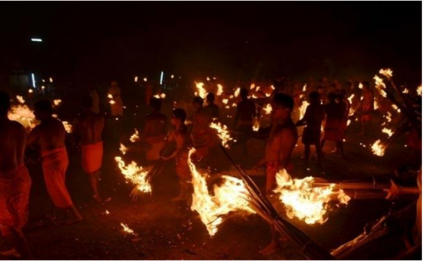ఈ నేపథ్యంలో భక్తులు నిర్వహించే అగ్నికేళి చూపరుల్లో ఉత్సాహాన్ని నింపింది. వ్రత నియమావళికి వచ్చిన భక్తుల బృందం కొబ్బరి ఈకలతో చేసిన తాటాకులను వెలిగించి ఒకరిపై ఒకరు విసురుకున్నారు. ఏటా ఈ జాతర ఏప్రిల్‌లో ఎనిమిది రోజులు పాటు జరుగుతుంది. అగ్నికేళిలో పాల్గొనే భక్తులు ఒకరికొకరు సుమారు 15 మీటర్ల దూరంలో ఎదురెదురుగా నిలబడతారు. కొబ్బరి ఈకలతో చేసిన తాటాకులను వెలిగించి ఒకరిపై ఒకరు విసురుకుంటారు. రాత్రి సమయంలో ఇలా అగ్ని కేళిలో పాల్గొన్న భక్తులతో ఆలయ ప్రాంగణం యుద్ధ వాతావారణాన్ని తలపిస్తుంది.