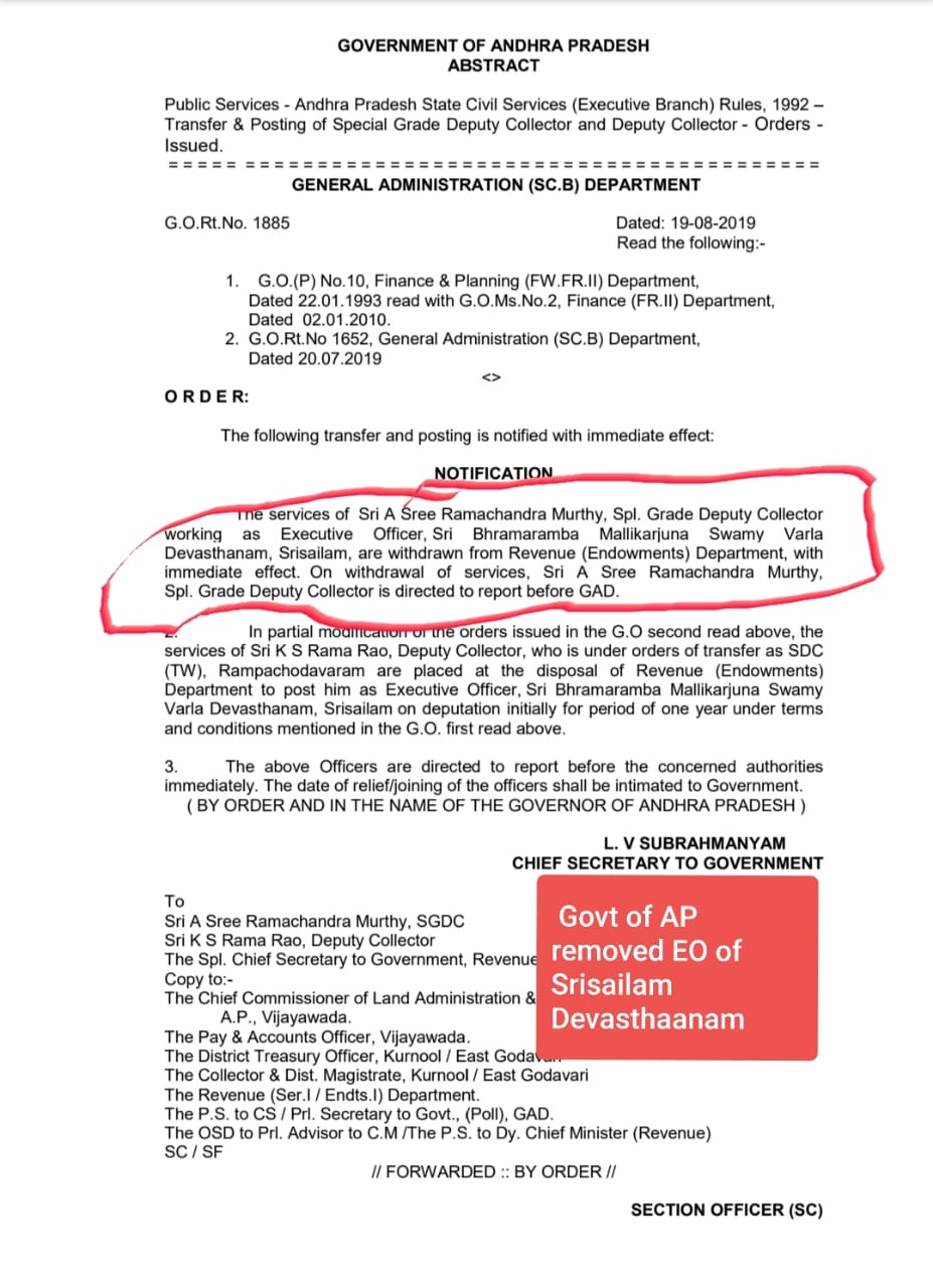 ఈ పరిణామాలన్నిటి మధ్యా ఈ వివాదమంతటికీ కేంద్ర బిందువైన ఈవో శ్రీరామచంద్ర మూర్తిని బదిలీ చేస్తూ నిర్ణయం తీసుకోవడం కొస మెరుపు. ఆయన స్థానేమరో అధికారిని నియమించనున్నారు. అంతే కాకుండా 16/8/19 న జరిగిన వేలాన్ని రద్దు చేస్తూ ప్రభుత్వం ఉత్తర్వులిచ్సినట్లుగా కూడా తెలుస్తోంది. ముందు ముందు ఏం జరుగనుందో చూడాలి.