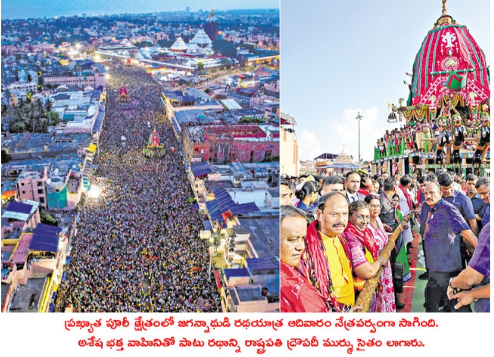 జై జగన్నాథ్‌ నామస్మరణ, జయజయద్వానాల మధ్య ఒడిశాలోని పూరీలో విశ్వప్రసిద్ధ జగన్నాథుని రథయాత్ర ఆదివారం వైభవోపేతంగా సాగింది. శ్రీక్షేత్రంలో 53 ఏళ్ల తర్వాత ఒకేరోజున పురుషోత్తముని నవయవ్వన దర్శనం, నేత్రోత్సవం, రథయాత్రలు ఏర్పాటయ్యాయి. తెల్లవారుజామున 4 గంటల నుంచే సేవలు ప్రారంభం కాగా, నిర్ణీత వ్యవధి కంటే 2 గంటల ముందుగా 11.30 గంటలకు జగన్నాథ, బలభద్ర, సుభద్ర, సుదర్శనుల పొహండి చేపట్టారు. ఈ వేడుక 2 గంటలపాటు సాగింది. రథారూఢులైన చతుర్థ మూర్తులకు పూరీ శంకరాచార్య నిశ్చలానంద సరస్వతి హారతిచ్చారు. పూరీ రాజు గజపతి దివ్యసింగ్‌దేవ్‌ రథాలపై ఆనవాయితీ ప్రకారం చెరాపహరా (బంగారు చీపురుతో ఊడ్చి) చేసి, రథాలకు సారథులు, ఆశ్వాలు అమర్చి తాళ్లు కట్టారు. సాయంత్రం 5 గంటలకు బలభద్రుని తాళధ్వజ రథం గుండిచా దేవీ ఆలయానికి బయలు దేరింది. భక్తులు ఉత్సాహంగా రథం లాగారు. తర్వాత సుభద్రదేవి దర్పదళన్‌ రథం బయలుదేరింది. జగన్నాథుని నందిఘోష్‌ రథాన్ని 5 అడుగుల దూరం లాగి ఉంచేశారు. నవయవ్వన దర్శనం, నేత్రోత్సవం, రథయాత్ర ఉత్సవాలు ఒకేరోజు కావడంతో రాత్రయ్యేలోపు రథాలు గుండిచాదేవి సన్నిధికి చేరుకోలేదు. సూర్యాస్తమయం తర్వాత యాత్ర కొనసాగించొద్దనే నిబంధన ఉండటంతో బొడొదండొలో మార్గమధ్యంలో నిలిపేశారు. దీంతో సోమవారం కూడా రథయాత్ర కొనసాగించి రథాలను గుండిచా మందిరం వద్దకు చేర్చనున్నారు.