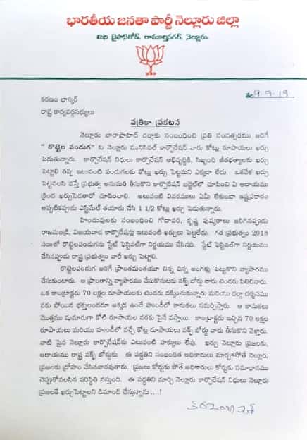 రొట్టెల పండుగ పేరుతో కార్పొరేషన్ అధికారులు ప్రతి ఏటా సుమారు ఒకటిన్నర కోట్ల రూపాయలు ఖర్చు చేస్తున్నారని భాస్కర్ తెలిపారు. హిందువులకు సంబంధించిన గోదావరి, కృష్ణా పుష్కరాల సందర్భంగా కూడా కార్పొరేషన్లు ఇలా ఖర్చు చేయలేదని, వాటికి ఆయన ఖర్చులను రాష్ట్ర ప్రభుత్వం మాత్రమే భరించిందని శ్రీ భాస్కర్ తెలిపారు.