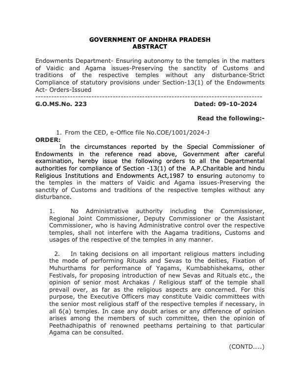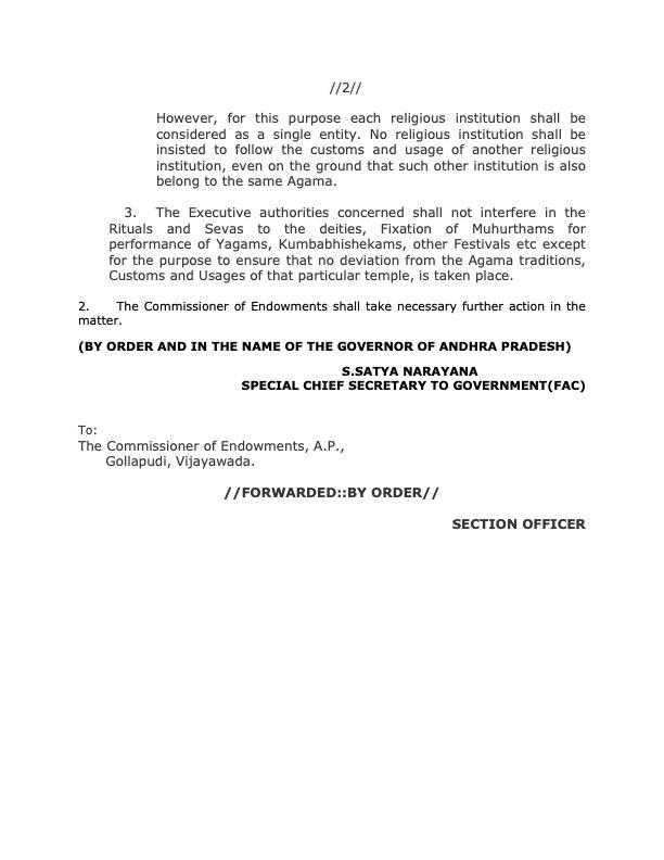ఆలయాల ఆగమ సంప్రదాయాలు, ఆచార వ్యవహా రాల్లో దేవదాయ శాఖ కమిషనర్ సహా ఆలయ ఈవో, తదితర అధికారులెవ్వరూ జోక్యం చేసుకోవద్దంటూ రాష్ట్ర ప్రభుత్వం ఉత్తర్వులు జారీచేసింది. వైదిక ఆగమ విషయాల్లో ఆలయాలకు స్వయం ప్రతిపత్తిని నిర్ధారించడానికి 1987 నాటి దేవదాయ శాఖ చట్టంలోని సెక్షన్-13(1)కి అనుగుణంగా అధికారులు ఆలయాల ఆచారాలు, సంప్రదాయాల పవిత్రతకు ఎలాంటి భంగం కలగకుండా ఉండేందుకు చేపడుతున్న చర్యల్లో భాగంగా ఈ ఆదేశాలు జారీచేస్తున్నట్లు దేవదాయ శాఖ ముఖ్య కార్యదర్శి ఎస్. సత్యనారాయణ బుధవారం జీఓ-223ను జారీచేశారు. వివిధ ఆలయాల్లో స్వామివార్లకు నిర్వహించే సేవలకు సంబంధించిన విధానాలు.. యాగాలు, కుంభాభి షేకాలు, ఇతర ఉత్సవాల నిర్వహణ వంటి విషయాలపై నిర్ణయాలు తీసుకోవడానికి అక్కడి సీనియర్ అర్చకులు, ఇతర మతపరమైన సిబ్బంది అభిప్రాయాలే పరిగ ణనలోకి తీసుకోవాలన్నారు. ఇందుకోసం ఈఓ వైదిక కమిటీలను ఏర్పాటుచేసు కోవచ్చని ఆయన ఉత్తర్వుల్లో సూచించారు. ఏదైనా సందేహం, అభిప్రా యభేదం ఏర్పడితే ప్రఖ్యాత పీఠాధిపతులను సంప్రదించవచ్చని పేర్కొన్నారు. ఇలాంటి అంశాల్లో ఏ ఆలయానికి ఆ ఆలయం లేదా ఇతర దేవదాయ ధార్మిక సంస్థలు ఒక స్వతంత్ర సంస్థగా పరిగణించబడతాయన్నారు. అలాగే, ఒకే రకమైన ఆగమాలకు సంబంధించిన ఆలయాలు, ధార్మిక సంస్థలైనప్పటికీ సంబంధిత ఆలయ ఆచారాలు, సంప్రదాయాలకు భిన్నంగా వేరొక ఆలయ సంప్రదాయాలు పాటించాలనిలేదని ఉత్తర్వుల్లో స్పష్టంచేశారు.