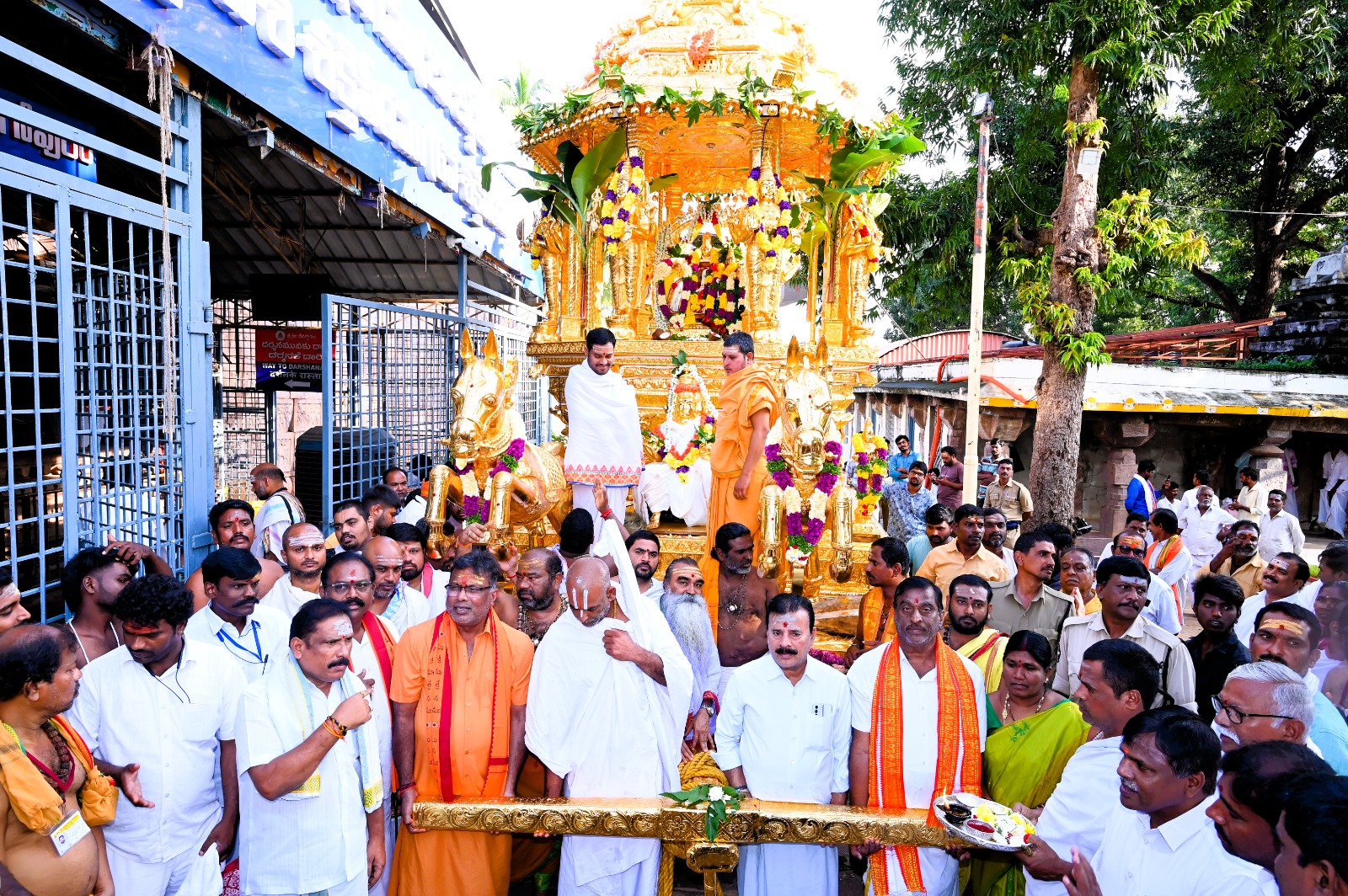 శ్రీశైలంలో ఘనంగా స్వర్ణరథోత్సవం బంగారు రథంపై ఆలయ మాడవీధులలో ఆది దంపతులు విహరింపు శ్రీశైలం దేవస్థానం ఆధ్వర్యంలో ఆరుద్ర నక్షత్రం సందర్భంగా బంగారు స్వర్ణరథోత్సవం దేవస్థానం ఈవో ఆధ్వర్యంలో ఘనంగా నిర్వహించారు శ్రీస్వామి అమ్మవార్ల స్వర్ణరథోత్సవంలో ప్రత్యేక పూజలు నిర్వహించి కర్పూర హారతులు సమర్పించారు అనంతరం స్వర్ణ రథోత్సవం ఆలయ రాజగోపురం నుండి ఆలయం మాడవీధులు హరిహర రాయి గోపురం బ్రహ్మానందరాయ గోపురం శివాజీ గోపురం మీదుగా మాడవీధులలో భక్తుల కోలాహలం నడుమ కోలాటాలు మేళతాళాలతో వైభవంగా స్వర్ణరథోత్సవం జరిగింది స్వర్ణ రథోత్సవం ఆలయ మాడవీధులలో జరుగుతుండడంతో భక్తులు తరలివచ్చి స్వర్ణ రథోత్సవం తిలకించారు స్వర్ణరథం పై ఆసీనులైన శ్రీ స్వామి అమ్మవార్లు స్వర్ణ రథంపై విహరిస్తూ భక్తులకు దర్శనమిచ్చారు స్వర్ణ రథోత్సవంలో ఈవో. చంద్రశేఖర్ రెడ్డి అధికారులు స్థానిక పోలీసులు పాల్గొన్నారు ముందుగా వేకువజామునే శ్రీస్వామివారికి మహాన్యాసపూర్వక ఏకాదశ రుద్రాభిషేకం,అన్నాభిషేకం, విశేషపూజలు నిర్వహించి అనంతరం మాడవీధులలో స్వర్ణరథోత్సవం నిర్వహించారు