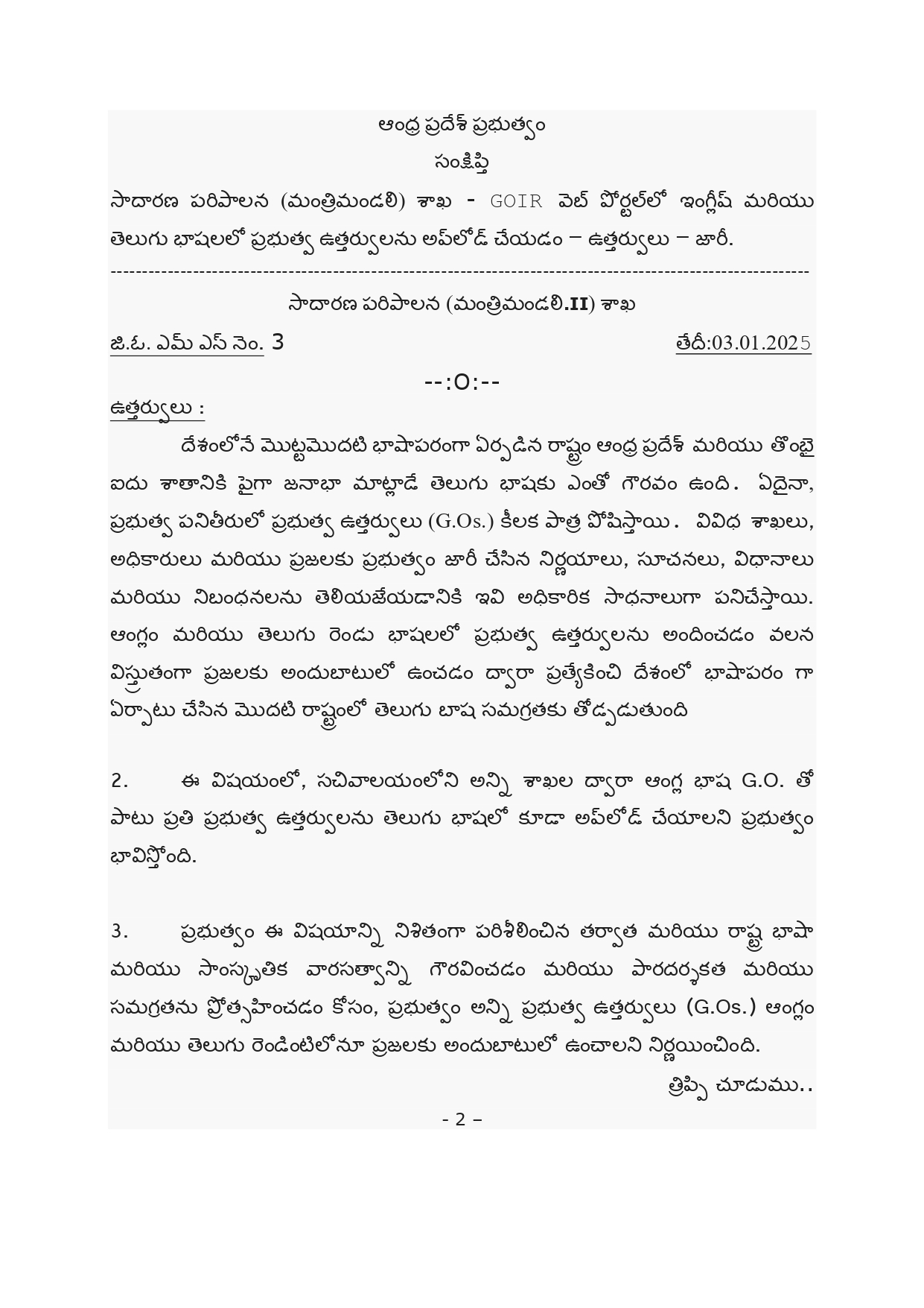 రాష్ట్రప్రభుత్వ ఉత్తర్వులు (జీవోలు) ఇకపై తెలుగులోనూ అందుబాటులోకి రానున్నాయి. జీవోలను ఉంచే జీవోఐఆర్ వెబ్పోర్టల్లో ఇకపై ప్రతి జీవోను ఆంగ్లంతోపాటు, తెలుగులోనూ అప్లోడ్ చేయాలని అన్ని శాఖలనూ ప్రభుత్వం ఆదేశించింది. ఈ మేరకు సాధారణ పరిపాలనశాఖ ఉత్తర్వులు జారీచేసింది. ‘దేశంలోనే మొదటి భాషాప్రయుక్త రాష్ట్రం ఆంధ్రప్రదేశ్. రాష్ట్రంలో 90 శాతానికి పైగా ప్రజలు తెలుగు మాట్లాడతారు. ప్రభుత్వ పాలనలో జీవోలు అత్యంత కీలకమైనవి. ప్రభుత్వ నిర్ణయాలు, సూచనలు, విధానాలు, నిబంధనలను వివిధ ప్రభుత్వ విభాగాలు, అధికారులు, ప్రజలకు చేరవేసే సాధానాలివి. ప్రభుత్వ ఉత్తర్వులను ఆంగ్లంతో పాటు తెలుగులో అందుబాటులోకి తేవడం.. వాటిలోని సమాచారం ఎక్కువమందికి చేరేందుకు, పారదర్శకతకు దోహదం చేస్తుంది’ అని ఆ ఉత్తర్వుల్లో ప్రభుత్వం పేర్కొంది. తెలుగు భాష, సాంస్కృతిక వారసత్వాలకు సముచిత గౌరవం ఇచ్చేందుకు ఈ నిర్ణయం తీసుకున్నట్లు పేర్కొంది.