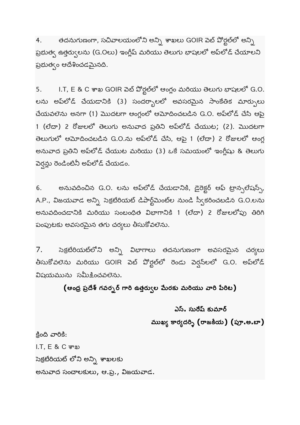 జీవోలను ఆంగ్లం, తెలుగు భాషల్లో అప్లోడ్ చేసేందుకు ఐటీశాఖ తగిన ఏర్పాట్లు చేయాలని ఆదేశించింది. దానికి మూడు రకాల ఐచ్ఛికాలను సూచించింది. మొదట ఆంగ్లంలో జీవోను అప్లోడ్ చేస్తే, ఒకటి రెండు రోజుల్లో అదే జీవోను తెలుగులో అందుబాటులోకి తేవాలని, మొదట తెలుగులో జీవోను పెడితే, ఒకటి రెండు రోజుల్లో ఆంగ్లంలో అప్లోడ్ చేయాలని సూచించింది. మూడో ఐచ్ఛికంగా రెండుభాషల్లోనూ ఒకేసారి జీవోలను అప్లోడ్ చేసే వెసులుబాటు ఉండాలని తెలిపింది. తెలుగులో జీవోలకు సంబంధించి సాధారణ పరిపాలనశాఖ శుక్రవారం విడుదల చేసిన జీవోను.. ఆంగ్లం, తెలుగు భాషల్లో అప్లోడ్ చేయడం ద్వారా ఆ ఉత్తర్వుల అమలుకు శ్రీకారం చుట్టింది.