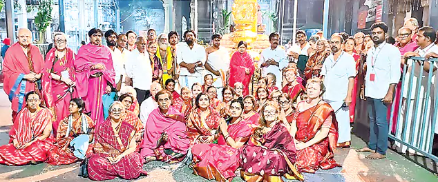 తిరుపతి జిల్లా శ్రీకాళహస్తిశ్వర ఆలయంలో తెలుగింటి సంప్రదాయాలు ఉట్టిపడేలా కట్టుబొట్టుతో అమెరికాకు చెందిన భక్తులు ఆకట్టుకున్నారు. పెంచలకోన సమీపంలోని కరుణామయి ఆశ్రమ నిర్వాహకురాలు విజయేశ్వరీదేవితో పాటు 70 మంది విదేశీ భక్తులు శుక్రవారం శ్రీకాళహస్తీశ్వరాలయ దర్శనార్థం వచ్చారు. వీరికి ఆలయ అధికారులు దర్శన ఏర్పాట్లు చేపట్టారు. స్వామి, అమ్మవార్లను దర్శించుకుని ప్రత్యేక పూజలు చేయించారు. స్వామి వారిని దర్శించుకుని రాహుకేతు పూజల్లో పాల్గొన్నారు. సంప్రదాయం ప్రకారం రాహు కేతు పూజలు నిర్వహించారు. స్వామి వారితో పాటుగా అమ్మవార్లను దర్శించుకున్నారు. ఈ సందర్భంగా ఆలయ అధికారులు వారికి దర్శన ఏర్పాట్లు నిర్వహించారు. హిందూ సంప్రదాయాలను, శ్రీకాళహస్తి శివాలయం విశిష్టతను అమెరికా భక్తులు కొనియాడారు. సంప్రదాయ వస్త్రాలు ధరించి పూజ కార్యక్రమంలో పాల్గొన్నారు. ఆలయ పూజారి వారికి తీర్థ ప్రసాదాలు అందజేశారు. ఆలయాన్ని సందర్శించడం సంతోషంగా ఉందని అమెరికన్లు తెలిపారు.