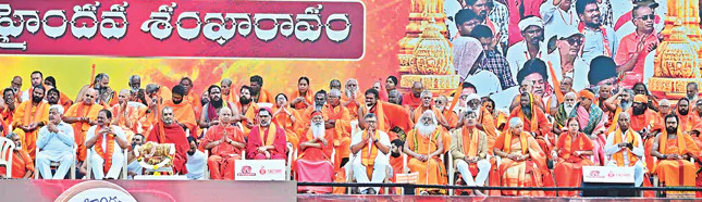 మన ఆలయాలను మనమే నిర్వహించుకుందాం హిందూ దేవాలయాలపై ప్రభుత్వ పెత్తనం పోవాలని… చిన్న గుడి నుంచి తిరుమల వెంకన్న ఆలయం వరకు అన్నింటికీ స్వయం ప్రతిపత్తి కల్పించి.. వాటి నిర్వహణను హిందువులకే అప్పగించాలని స్వామీజీలు, ధార్మిక సంస్థల ప్రతినిధులు కోరారు. హిందూధర్మ పరిరక్షణకు ప్రతి ఒక్కరూ కంకణబద్ధులు కావాలని, గ్రామస్థాయి నుంచి జాతీయస్థాయి వరకు.. అన్ని రాష్ట్రాల్లో ఈ ఉద్యమాన్ని బలోపేతం చేయాలని దిశానిర్దేశం చేశారు. కృష్ణాజిల్లా కేసరపల్లిలో విశ్వహిందూ పరిషత్తు ఆధ్వర్యంలో ఆదివారం ‘హైందవ శంఖారావం’ భారీ సభ నిర్వహించారు. దీనికి పలు ప్రాంతాల నుంచి పెద్దఎత్తున ప్రజలు తరలివచ్చారు. వీహెచ్పీ అఖిలభారత అధ్యక్షుడు ఆలోక్కుమార్, ఉపాధ్యక్షుడు గోకరాజు గంగరాజు, కొండవీటి జ్యోతిర్మయి, ఇతర ప్రముఖులు హిందూ సమాజాన్ని కార్యోన్ముఖుల్ని చేసేలా ప్రసంగించారు. దేవాలయాలు హిందూ సమాజానికి మూలస్తంభాలని, వీటిపై దాడులు జరగడం బాధాకరమన్నారు. 130 కోట్ల మంది భారతీయులను జైశ్రీరామ్ అనే నినాదం బయటకు రప్పించిందని… ఆ క్రమంలోనే అయోధ్యలో రామమందిరం సాకారమైందన్నారు. హిందూ ధర్మరక్షణలో అన్ని వర్గాలనూ భాగస్వాములను చేసేలా తదుపరి కార్యాచరణ ఉండాలని డిక్లరేషన్ ప్రకటించారు. ఈ స్ఫూర్తి క్షేత్రస్థాయిలోనూ కొనసాగించేలా సభకు వచ్చినవారితో చినజీయర్స్వామి ప్రతిజ్ఞ చేయించారు. ___________________________________