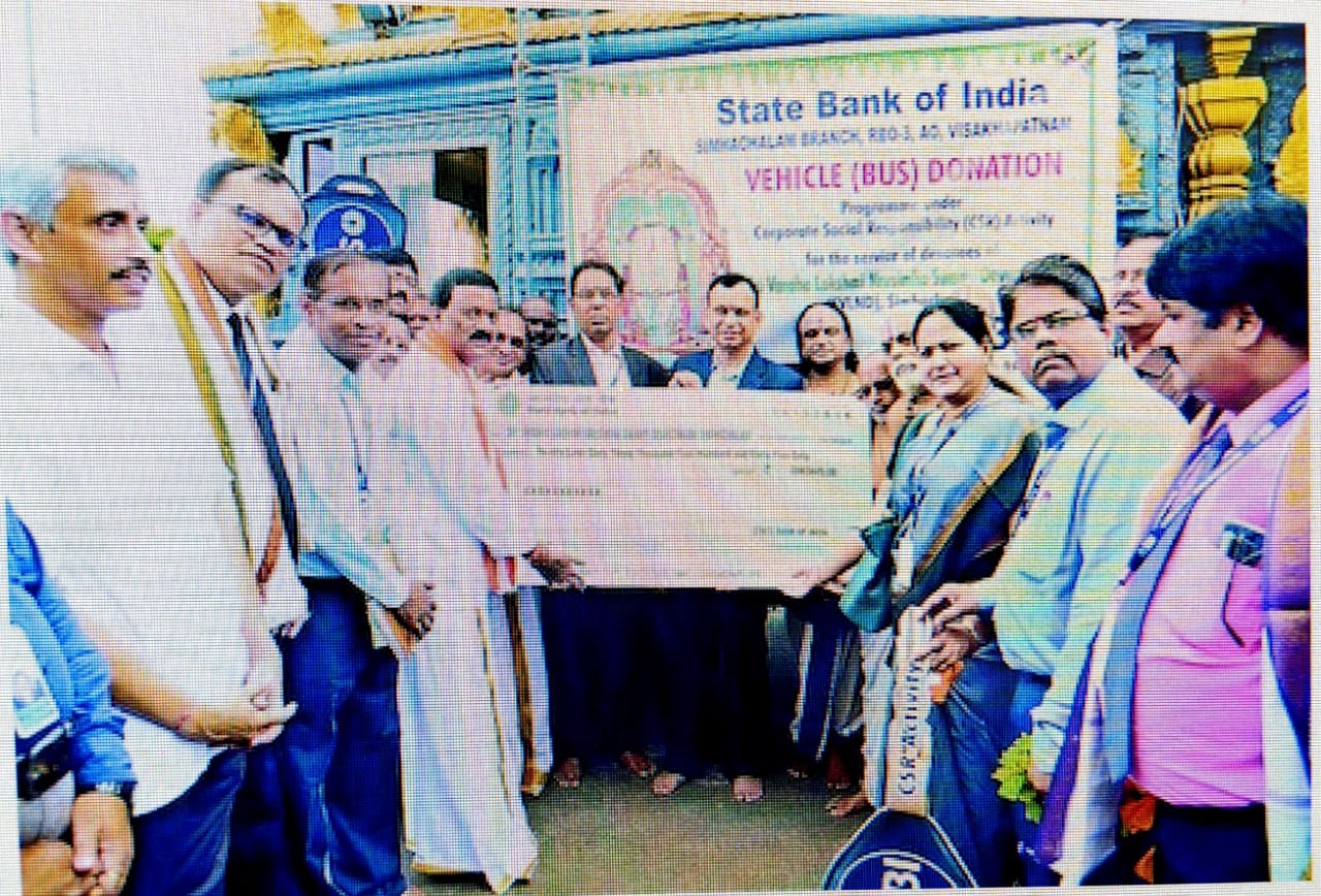 కేంద్ర ప్రభుత్వం యొక్క “కార్పొరేట్ సామాజిక బాధ్యత” నినాదాన్నందుకుని పలు కార్పొరేట్ సంస్థలు చేస్తున్న సేవా కార్యక్రమాలు సమాజానికి మేలు చేసేవిగా ఉన్నాయి. స్టేట్ బ్యాంక్ ఆఫ్ ఇండియా వారు కార్పొరేట్ సామాజిక బాధ్యతలో భాగంగా సింహాచలం దేవస్థానం వారికి నూతనంగా ఒక బస్ కొనుగోలు చేయుటకు గాను 20.63 లక్షల రూపాయలు విరాళంగా ఇచ్చారు. దీంతో శ్రీ వరాహలక్ష్మీ నరసింహస్వామి వారి దర్శనానికి వచ్చే భక్తులకు మరింత సౌకర్యం కల్పించి నట్లైంది. గురువారం సింహాచలం కొండపైన జరిగిన కార్యక్రమంలోSBI మేనేజింగ్ డైరెక్టర్ శ్రీ B. రమేష్ బాబు దేవస్థానం ఎగ్జిక్యూటివ్ ఆఫీసర్ శ్రీ M.వెంకటేశ్వరరావు చెక్కును అందజేశారు. ఈ కార్యక్రమంలో SBI జనరల్ మేనేజర్ శ్రీ BVSKT భాస్కర్, రీజినల్ మేనేజర్ శ్రీ YVSS నాగేశ్వరరావు, సింహాచలం మానేజర్ శ్రీ K. సౌమిత్రి, శ్రీ V.సత్యనారాయణ ఆలయ సిబ్బంది మరియు అర్చకులు పాల్గొన్నారు.