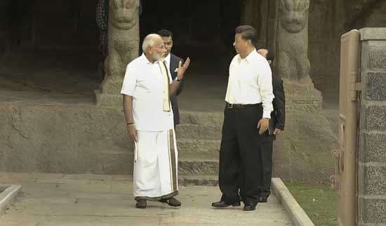 చైనా అధ్యక్షుడు షీ జిన్పింగ్ , ప్రధాని నరేంద్రమోదీ మహాబలిపురం పర్యటన కొనసాగుతోంది. నిన్న సాయంత్రం మహాబలిపురం చేరుకున్న ఇరుదేశాధినేతలు పలుచారిత్రక ప్రదేశాలను సందర్శించారు. ఈ సందర్భంగా ప్రధాని మోడీ తమిళనాడు సంప్రదాయాన్ని ప్రతిబింబించే వస్త్రాలను ధరించారు. మహాబలిపురంలోని పలు చారిత్రక కట్టడాలను వీక్షిస్తూ ఇరువురు నేతలు వివిధ అంశాలపై మాట్లాడుకున్నారు. చారిత్రక కట్టడాల విశిష్టత, శిల్ప కళా సౌందర్యాన్ని జిన్పింగ్కు మోడీ వివరించారు. పరమశివుడి నుంచి అర్జునుడు పాశుపతాస్త్రం పొందే శిల్పాన్ని , కృష్ణుడి వెన్నముద్ద శిలను, ఏకశిలాకట్టడాలైన పంచరథాలు, ఇతర విగ్రహాలను ఇరువురు నేతలు సందర్శించారు. వెయ్యేళ్ల క్రితం వీటిని నిర్మించిన పల్లవరాజుల గొప్పదనాన్ని జిన్పింగ్కు మోడీ వివరించారు. ఆలయ ప్రాంగణంలోనే కొబ్బరి బోండాలు సేవిస్తూ పలు అంశాలపై ఇరువురూ మాట్లాడుకున్నారు.అనంతరం మహాబలిపురం సముద్రతీర ఆలయంలో ఏర్పాటు చేసిన సాంస్కృతిక కళాప్రదర్శనలను మోడీ, జిన్పింగ్ వీక్షించారు. చెన్నైకి చెందిన కళాక్షేత్ర విద్యార్థులు సాంస్కృతిక ప్రదర్శనలిచ్చారు. జిన్పింగ్ గౌరవార్థం రాత్రికి మోడీ విందు ఇచ్చారు.