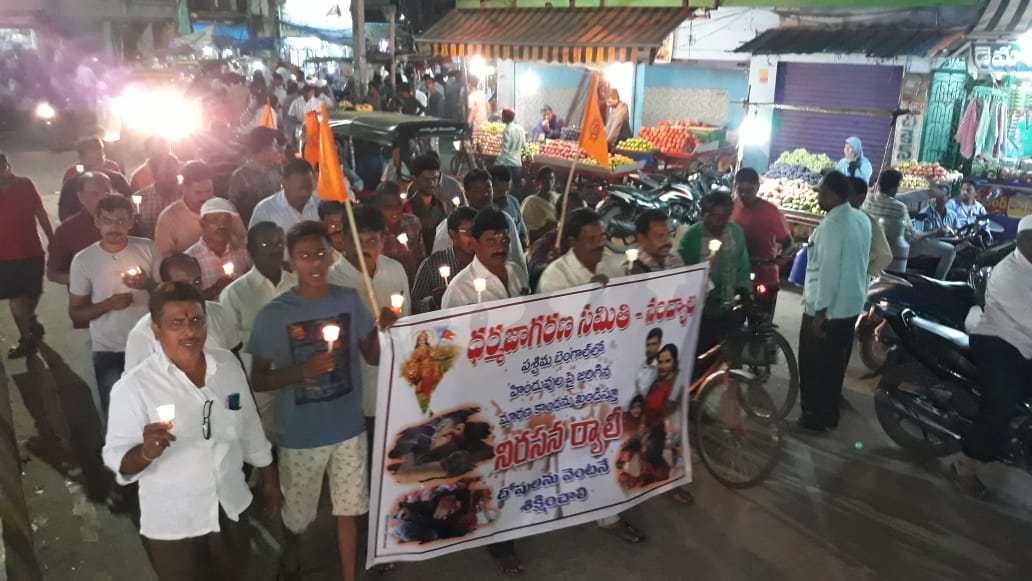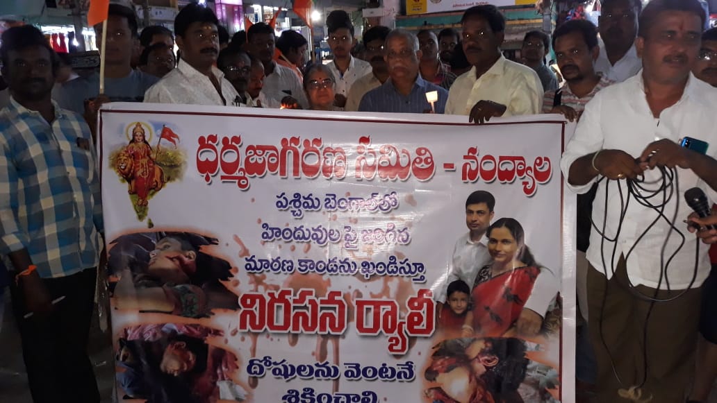 పశ్చిమ బెంగాల్ ఘటనను తీవ్రంగా నిరసిస్తూ ధర్మ జాగరణ సమితి సమితి ఆధ్వర్యంలో నంద్యాలలోని స్థానిక వివేకనంద సెంటర్ నుంచి గాంధీ చౌక్ వరకు కొవ్వొత్తులతో నిరసన ర్యాలీ జరిగింది.