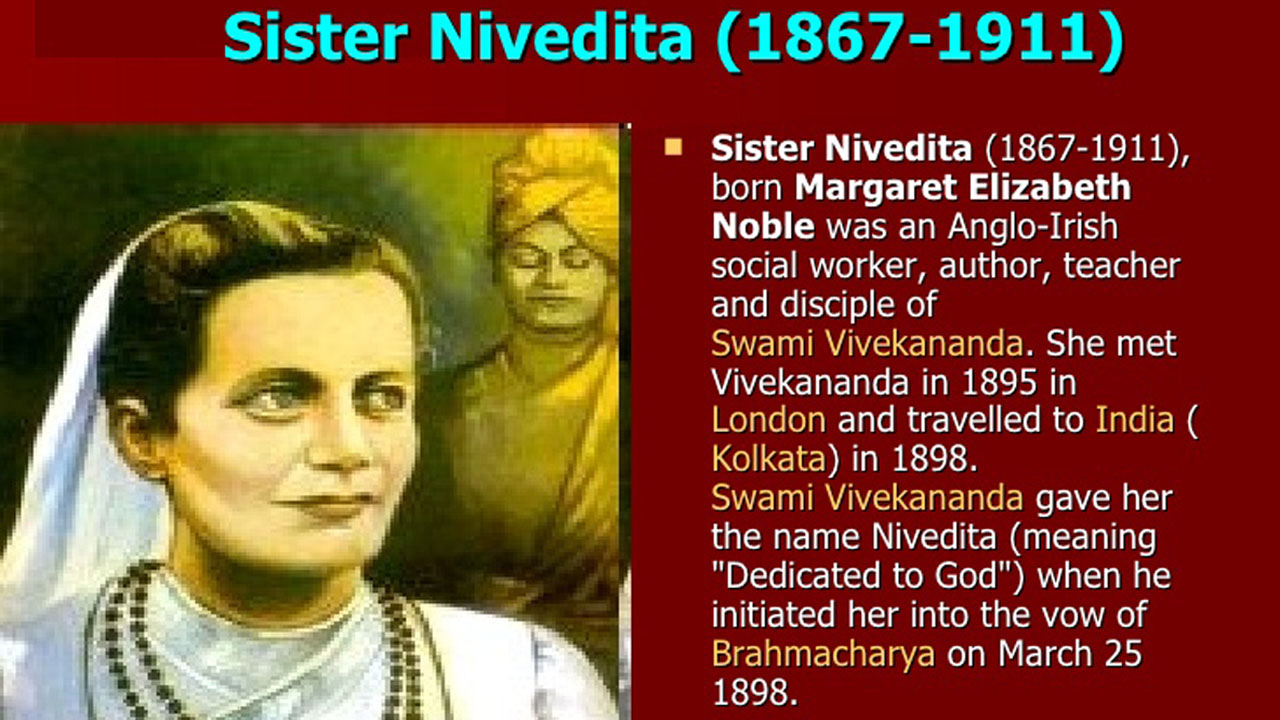 స్వామి వివేకానంద విదేశీ శిష్యురాండ్రలో ఒకరిగా సోదరి నివేదిత (స్వామికి ఎడమ వైపు )
