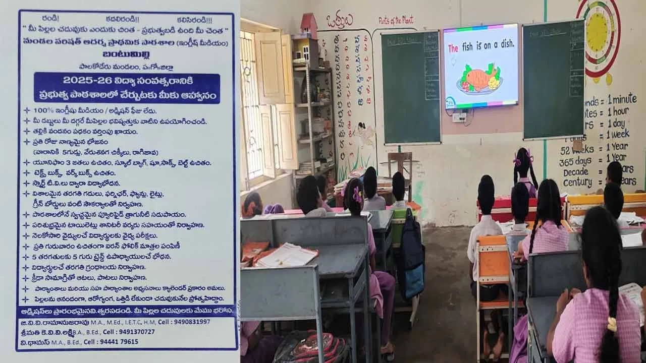 పిల్లలను తమ బడిలో చేర్పించండి.. మంచిగా విద్యాబుద్ధులు నేర్పిస్తాం అంటూ వినూత్న కార్యక్రమం చేపట్టారు సర్కారు బడి మాస్టార్లు. పశ్చిమగోదావరి జిల్లా పాలకొడేరు మండలం శృంగవృక్షం శివారు బంటుమిల్లి గ్రామంలో ప్రభుత్వ పాఠశాల ఉంది. అయితే అక్కడ చదువు మంచిగా చెబుతున్నా విద్యార్థులు చేరడంలేదు. అందరూ ప్రయివేటు స్కూల్ లో చేరుతున్నారు. తమ బడిలో పిల్లలను చేర్చుకోవడానికి ఏం చేయాలా అనే ఆలోచనలో పడ్డారు ఆ స్కూల్ లో పని చేస్తున్న టీచర్లు. ముందుగా ఎంతమంది ప్రయివేటు స్కూల్ కు వెళుతున్నారు అనేది గ్రామంలో సర్వే చేసి తెలుసుకున్నారు.