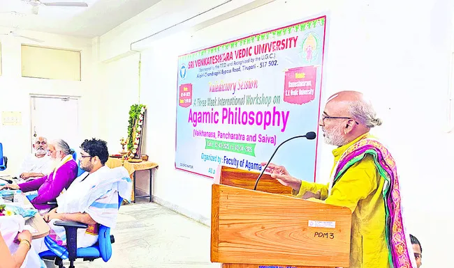 అర్చకులను భగవంతుని సేవకు చేరువ చేసేది ఆగమశాస్త్రమేనని ఎన్‌ఎస్‌యూ ప్రొఫెసర్‌ సీ.రంగనాథన్‌ అన్నారు. ఎస్వీ వేదిక్‌ వర్సిటీలో 21 రోజులుగా నిర్వహిస్తున్న అంతర్జాతీయ సిద్ధాంత కార్యశాల ముగిసింది. ముఖ్యఅతిథిగా రంగరాథన్‌ మాట్లాడారు. ఆగమశాస్త్రంలోని రహస్యాలను తెలుసుకోవాలంటే వర్క్‌షాపులు ప్రధాన భూమిక పోషిస్తాయన్నారు. దైవారాధన క్రియలలో లోతైన జ్ఞానాన్ని పొందడం వల్ల లోకానికి మంచి జరుగుతుందన్నారు. శ్రీకాళహస్తి ప్రధాన అర్చకులు పరశురామ గురుకుల్‌ శివ అద్వైతం, అర్చన ప్రక్రియలో సిద్ధాంత స్వరూపం గురించి వివరించారు. అనంతరం వీసీ రాణి సదాశివమూర్తి వర్క్‌షాపు ప్రాధాన్యతను తెలియజేశారు. రిజిస్ట్రార్‌ భాస్కరుడు, డీన్‌ రాజేష్‌కుమార్‌, సహ సంచాలకులు డాక్టర్‌ రామకృష్ణ, డాక్టర్‌ భరత్‌ శేఖరాచార్యులు, డాక్టర్‌ కార్తికేయన్‌, డాక్టర్‌ టీ.బ్రహ్మాచార్యులు, అధ్యాపకులు, పండితులు, విద్యార్థులు పాల్గొన్నారు.