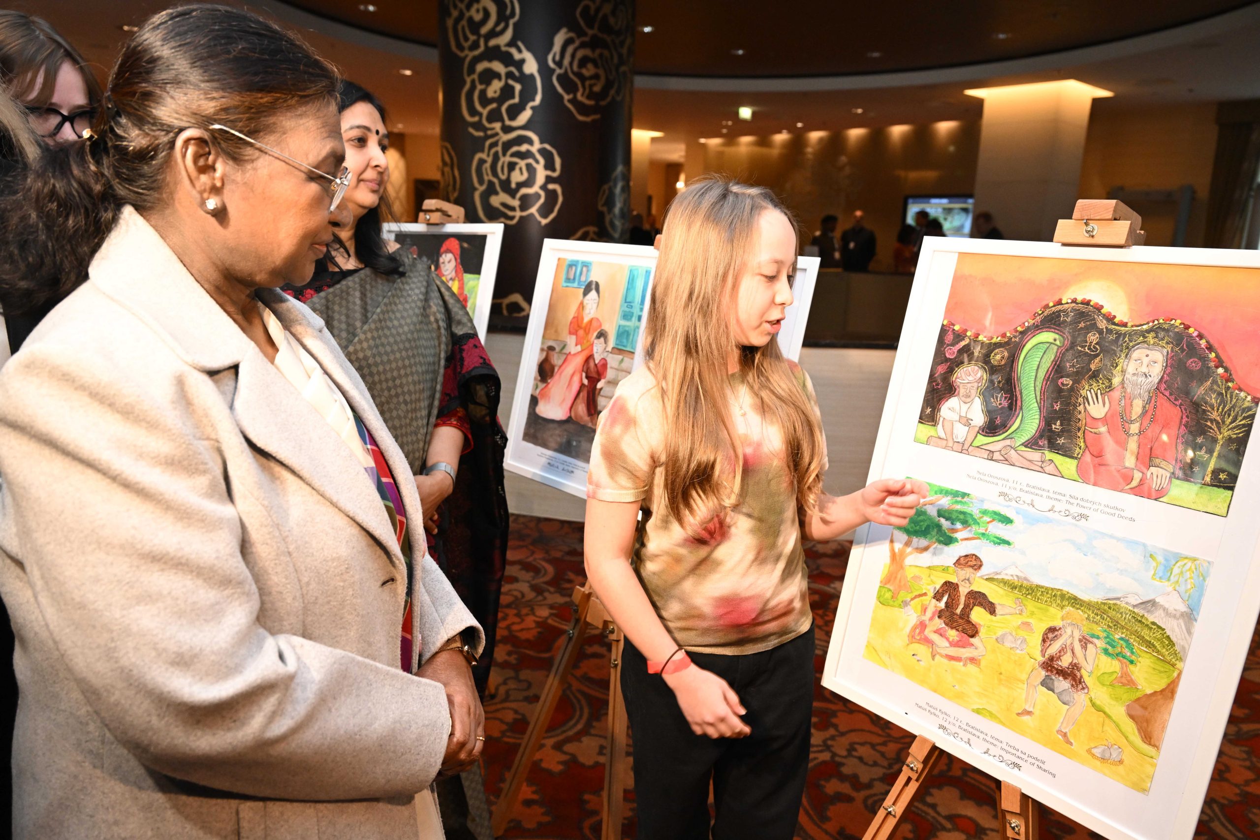 స్లొవేకియాలోని అత్యంత ప్రాచీన నగరంగా నిట్రకు పేరుంది. అంతకు ముందు, రాష్ట్రపతి ముర్ము ప్రెసోవ్ నగరంలోని బబడ్లో పప్పెట్ థియేటర్లో ప్రదర్శించిన రామాయణం తోలు బొమ్మలాటను తిలకించారు. శ్రీకృష్ణుని భక్తురాలు, భారతీయ సంస్కృతిని అభిమానించే లెంకా ముకోవా అలియాస్ లేఖా స్రవంతి దేవిదాసి ఈ షోను రూపొందించారు. ఈ ప్రదర్శనకు 150 మంది స్లొవాక్ విద్యార్థులు హాజరయ్యారు. అనంతరం భారతీయ పంచతంత్ర, జాతక కథలు ఇతివృత్తంగా స్లొవాక్ చిన్నారులు వేసిన పెయింటింగ్స్ ఎగ్జిబిషన్ను రాష్ట్రపతి ముర్ము తిలకించారు. ఈ సందర్భంగా ఆమె విద్యార్థులతో మాట్లాడారు.