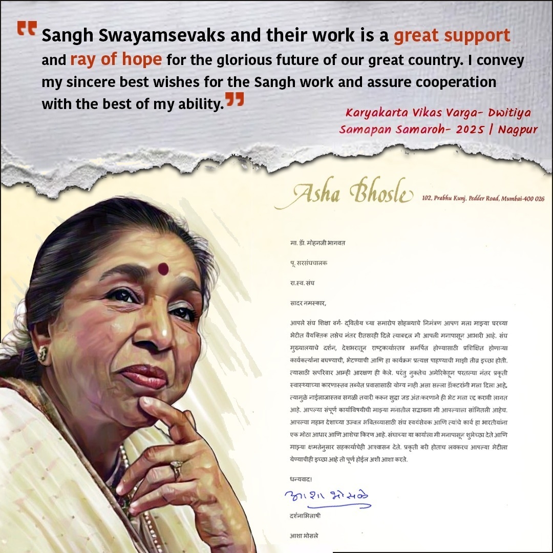 ఆర్ఎస్ఎస్ కార్యకర్తలు దేశసేవ లక్ష్యంగా సాగుతున్నారని, వారి కార్యం భారతదేశానికి ఆశాకిరణమని ప్రముఖ చలనచిత్ర గాయని ఆశా భోస్లే కొనియాడారు. గురువారం నాగ్పూర్లో జరిగిన కార్యకర్త వికాస వర్గ ముగింపు వేడుకలో పాల్గొనలేకపోయినందుకు చింతిస్తూ సర్సంఘ్చాలక్ డాక్టర్ మోహన్ భాగవత్ గారికి ఆమె రాసిన లేఖలో తమ ఆకాంక్షలను వ్యక్తం చేశారు. ఆశా భోస్లే లేఖ యథాతథంగా…