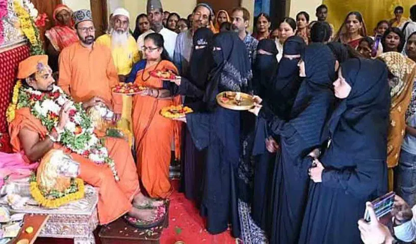 గురుపూర్ణిమ వేడుకలో ముస్లింలు కూడా పాల్గొన్నారు. బురఖా ధరించిన ముస్లిం మహిళలు జగద్గురు బాలక్ దేవాచార్య మహారాజ్‌కు హిందూ సంప్రదాయం ప్రకారం స్వాగతం పలికారు. ఆయనకు తిలకం అద్దడంతోపాటు హారతి ఇచ్చారు. ఈ వీడియో క్లిప్‌ సోషల్‌ మీడియాలో వైరల్‌ అయ్యింది. ఉత్తరప్రదేశ్‌లోని వారణాసిలో ఈ సంఘటన జరిగింది. గురువారం గురుపూర్ణిమ సందర్భంగా రామనంది శాఖకు చెందిన పురాతన పాతాళపురి మఠాధిపతి జగద్గురు బాలక్ దేవాచార్య మహారాజ్‌కు హిందువులతోపాటు ముస్లింలు స్వాగతం పలికారు. రాముడి పేరున్న వస్త్రం కప్పి సత్కరించారు. బురఖా ధరించిన ముస్లిం మహిళలు ఆయనకు తిలకం అద్దడంతోపాటు హారతి ఇచ్చారు. ఆయన ఆశీస్సులు పొందారు. సాంస్కృతిక, మత సామరస్యాన్ని చాటారు.