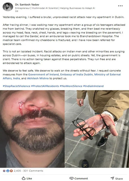 భారతీయ సంతతి వ్యక్తులపై ఐర్లాండ్లో దాడులు పెరుగుతున్నట్లు అతను పేర్కొన్నారు. డిన్నర్ చేసిన తర్వాత తన అపార్ట్మెంట్ వద్ద వాకింగ్ చేస్తున్న సమయంలో ఆరుగురు వ్యక్తులు అటాక్ చేసినట్లు సంతోశ్ యాదవ్ తెలిపారు. తన కంటి అద్దాలను తీసివేసి.. నిర్దాక్షిణ్యంగా తల, మెడపై దాడి చేశారన్నారు. రోడ్డుపైనే రక్తం కారుతున్న దశలో తనను వదిలేయడంతో అంబులెన్స్కు ఫోన్ చేశానని, వాళ్లు ఆస్పత్రిలో చేర్పించినట్లు తెలిపారు. తన దవడ ఎముక విరిగినట్లు మెడికల్ బృందం పేర్కొన్నట్లు తన పోస్టులో తెలిపారు.