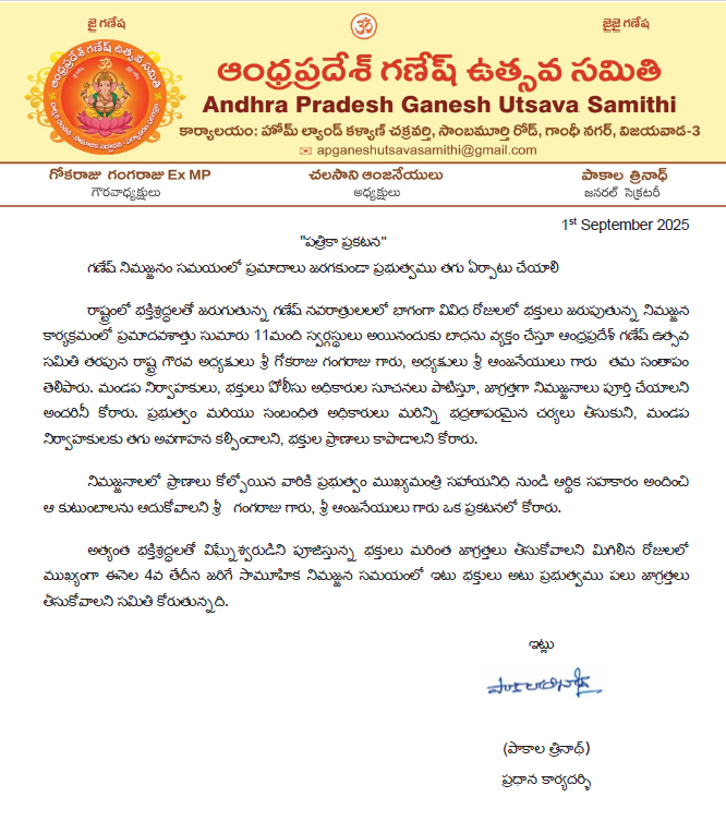 రాష్ట్రంలో భక్తిశ్రద్ధలతో జరుగుతున్న గణేష్ నవరాత్రులలలో భాగంగా వివిధ రోజులలో భక్తులు జరుపుతున్న నిమజ్జన కార్యక్రమంలో ప్రమాదవశాత్తు సుమారు 11మంది స్వర్గస్థులు అయినందుకు బాధను వ్యక్తం చేస్తూ ఆంధ్రప్రదేశ్ గణేష్ ఉత్సవ సమితి తరపున రాష్ట్ర గౌరవ అధ్యక్షులు శ్రీ గోకరాజు గంగరాజు గారు, అధ్యక్షులు శ్రీ ఆంజనేయులు గారు తమ సంతాపం తెలిపారు. మండప నిర్వాహకులు, భక్తులు పోలీసు అధికారుల సూచనలు పాటిస్తూ, జాగ్రత్తగా నిమజ్జనాలు పూర్తి చేయాలని అందరినీ కోరారు. ప్రభుత్వం మరియు సంబంధిత అధికారులు మరిన్ని భద్రతాపరమైన చర్యలు తీసుకుని, మండప నిర్వాహకులకు తగు అవగాహన కల్పించాలని, భక్తుల ప్రాణాలు కాపాడాలని కోరారు.