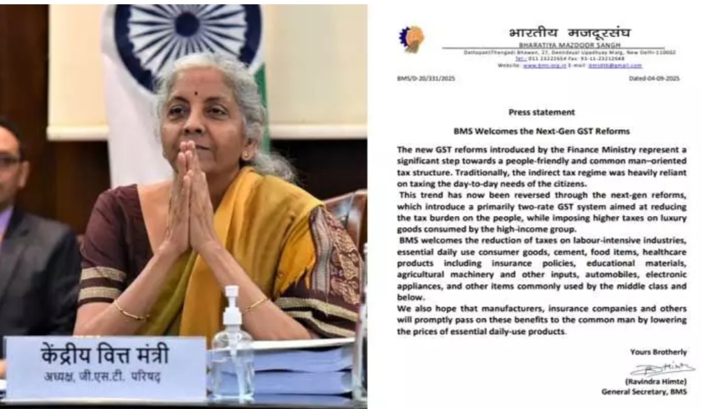 జీఎస్టీ కౌన్సిల్ సమావేశం తర్వాత నిత్యవసరాలతో పాటు కీలక వస్తులపై జీఎస్టీని తగ్గిస్తున్నట్లు ఆర్థిక మంత్రి ప్రకటించిన విషయం తెలిసిందే. అయితే కేంద్రం తీసుకున్న ఈ నిర్ణయం పై దేశవ్యాప్తంగా ఉన్న వివిధ సంఘాలు సంతోషం వ్యక్తం చేస్తున్నాయి. ఈ క్రమంలో భారతీయ మజ్దూర్ సంఘ్ GST సంస్కరణల స్పందిస్తూ.. “ఆర్థిక మంత్రిత్వ శాఖ ప్రవేశపెట్టిన కొత్త GST సంస్కరణలు పన్ను నిర్మాణం వైపు ఒక ముఖ్యమైన అడుగును సూచిస్తాయని అభిప్రాయపడింది. సాంప్రదాయకంగా, పరోక్ష పన్ను విధానం పౌరుల రోజువారీ అవసరాలపై పన్ను విధించడంతో ఎక్కువ ప్రభావం ఉండేది. తాజాగా దేశ ప్రజలకు అవసరమైన రోజువారీ వినియోగ వస్తువులు, బీమా పాలసీలు, విద్యా సామగ్రి, వ్యవసాయ యంత్రాలు, ఇతర ఇన్పుట్లు, ఆటోమొబైల్స్, ఎలక్ట్రానిక్ ఉపకరణాలు, మధ్యతరగతి ప్రజలు సాధారణంగా ఉపయోగించే ఇతర వస్తువులపై పన్ను తగ్గింపును తాము స్వాగతిస్తున్నాము” అని భారతీయ మజ్దూర్ సంఘ్ ఓ ప్రకటనలో స్పష్టం చేసింది.
