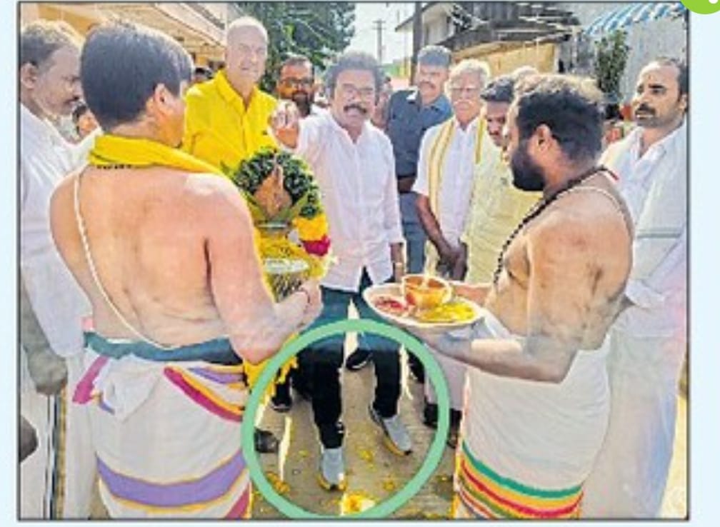 బూట్లతో స్వామివారికి ఎమ్మెల్యే పట్టువస్త్రాలు