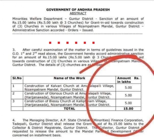 The GO says ‘After careful examination of the matter…., the government hereby accord administrative sanction for an amount of Rs. 15 Lakhs which would be Rs. 5 Lakh per church as aid towards construction of (3) churches in various villages of Nizampatnam Mandal, Guntur District.’ The GO then specifies that the AP State Christian Finance Corporation, a Government body shall release the grants to the collector and district magistrate of Guntur.