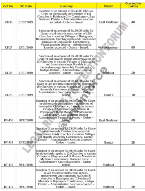 Legal Rights Protection Forum (LRPF) has unearthed scathing documents that reveal as to why they are silent over Jagan government’s move to fund constitution of churches. The documents which are in possession of LRPF show that the TDP government between 2018 and 2019, sanctioned Rupees 38.36 crores for Construction, Repair and Renovation of Churches in AP by passing 54 GOs. It even sanctioned Rs. 58 Lakhs for construction & repair of toilets in Churches through GO RT-408 on 29.11.2018.