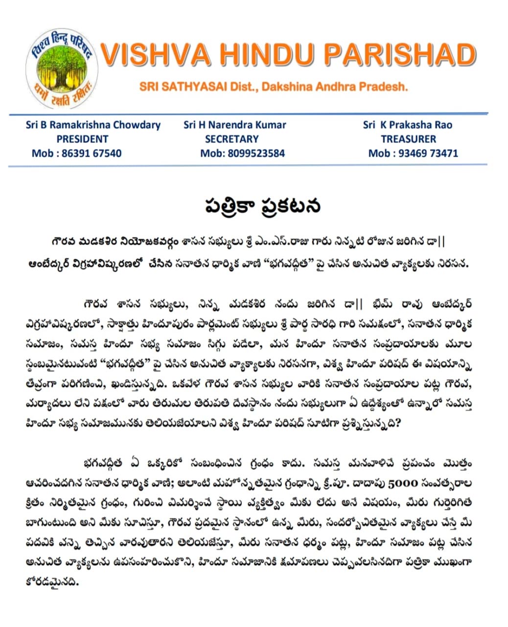 ఇంతకీ ఏం జరిగిందంటే.. ఎమ్మెల్యే, ఎంఎస్ రాజు తాజాగా ఓ కార్యక్రమంలో మాట్లాడుతూ..‘భగవద్గీత ప్రజల బతుకులను మార్చలేదంటూ వ్యాఖ్యలు చేశారు. దీంతో, ఆయన వ్యాఖ్యలు సోషల్ మీడియాలో వైరల్ అయ్యాయి. టీటీడీ బోర్డు సభ్యుడిగా ఉంటూ భగవద్గీతపై అనుచిత వ్యాఖ్యలు చేయడంతో సర్వత్రా విమర్శలు వచ్చాయి. ఇక, తాజాగా టీడీపీ ఎమ్మెల్యే ఎంఎస్ రాజు వ్యాఖ్యలపై విశ్వహిందూ పరిషత్ స్పందించారు. ఈ సందర్బంగగా ఎమ్మెల్యే ఎంఎస్ రాజు బహిరంగ క్షమాపణలు చెప్పాలని డిమాండ్ చేశారు.