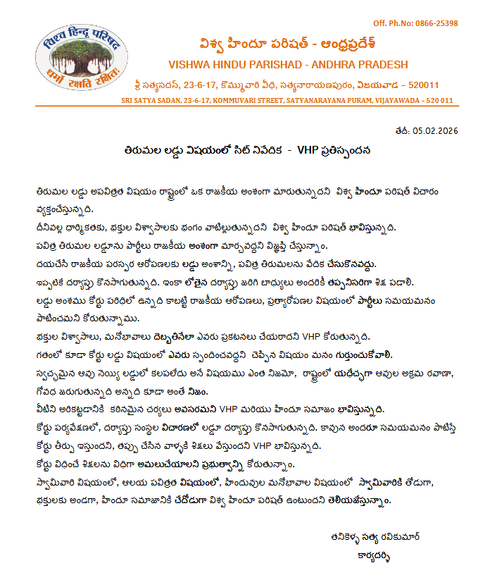 తిరుమల లడ్డు అపవిత్రత విషయం రాష్ట్రంలో ఒక రాజకీయ అంశంగా మారుతున్నదని విశ్వ హిందూ పరిషత్ విచారం వ్యక్తంచేస్తున్నది. దీనివల్ల ధార్మికతకు, భక్తుల విశ్వాసాలకు భంగం వాటిల్లుతున్నదని విశ్వహిందూ పరిషత్ భావిస్తున్నది. పవిత్ర తిరుమల లడ్డూను పార్టీలు రాజకీయ అంశంగా మార్చవద్దని విజ్ఞప్తి చేస్తున్నాం.దయచేసి రాజకీయ పరస్పర ఆరోపణలకు లడ్డు అంశాన్ని, పవిత్ర తిరుమలను వేదిక చేసుకొనవద్దు.ఇప్పటికే దర్యాప్తు కొనసాగుతున్నది. ఇంకా లోతైన దర్యాప్తు జరిగి బాధ్యులు అందరికీ తప్పనిసరిగా శిక్ష పడాలి.