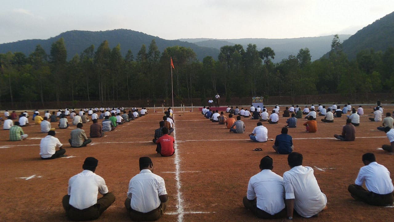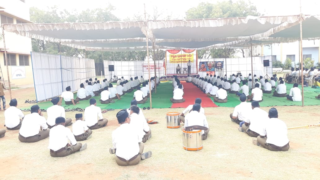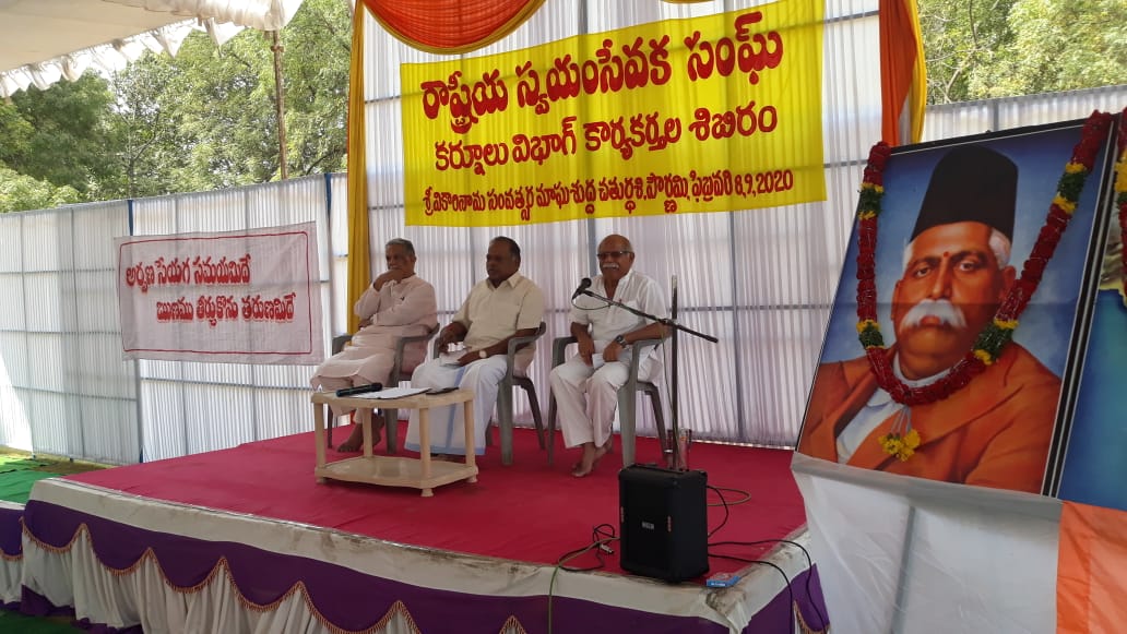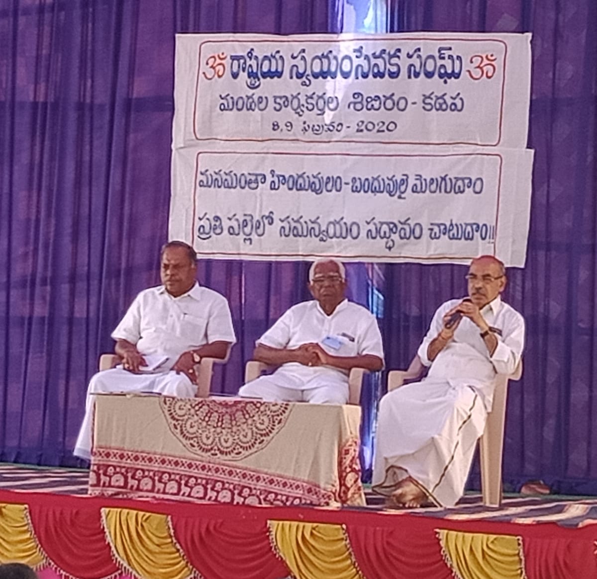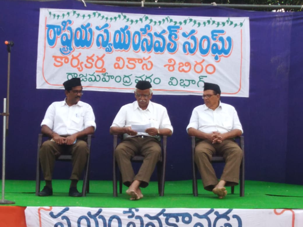 వేదికపై ఆర్ ఎస్ ఎస్ క్షేత్ర ప్రచారక్ శ్రీ శ్యాంకుమార్, మాననీయ విభాగ్ సంఘ్ చాలక్ శ్రీ KSN చారి, వర్గాధికారి