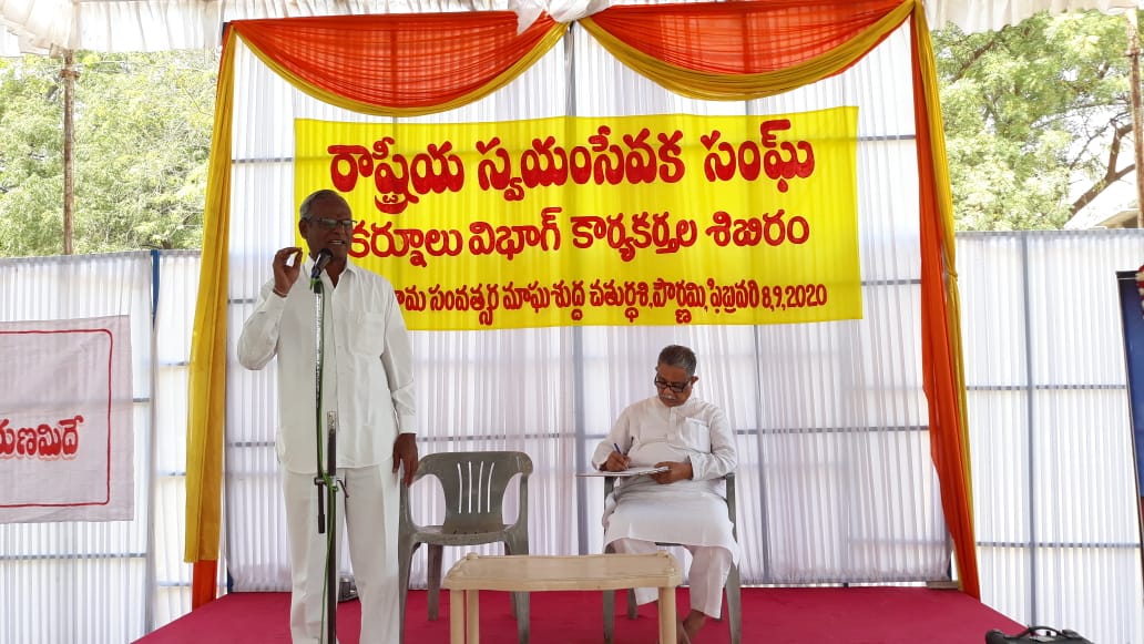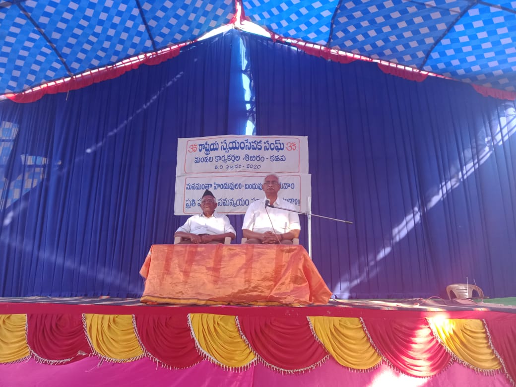 తిరుపతి విభాగ్ శిబిర ఉద్ఘాటనలో మాట్లాడుతున్న ప్రాంత ప్రచారక్ శ్రీ భరత్ గారు, వారి పక్కన విభాగ్ కార్యవాహ