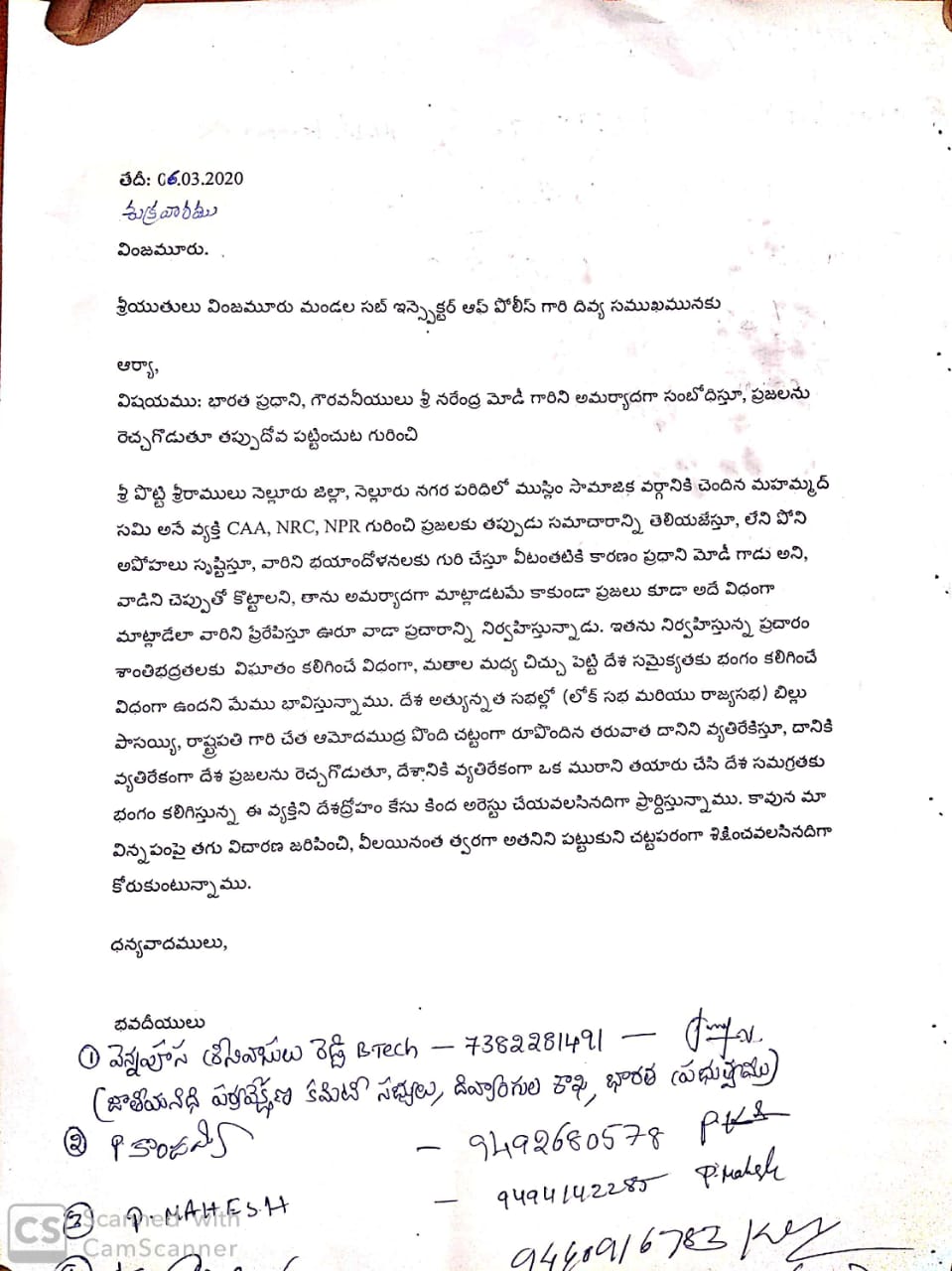 నెల్లూరులోని మహమ్మద్ షమి అనే ముస్లిం నాయకుడు CAA, NRC, NPR గురించి ప్రజలకు తప్పుడు సమాచారాన్ని తెలియజేస్తూ, లేని పోని అపోహలు సృష్టిస్తూ, వారిని భయాందోళనలకు గురి చేస్తూ వీటంతటికి కారణం ప్రధాని మోడీ గాడు అని, వాడిని చెప్పుతో కొట్టాలని, తాను అమర్యాదగా మాట్లాడటమే కాకుండా ప్రజలు కూడా అదే విధంగా మాట్లాడేలా వారిని ప్రేరేపిస్తూ ఊరూ వాడా ప్రచారాన్ని నిర్వహిస్తున్నాడని, ఇతను నిర్వహిస్తున్న ప్రచారం శాంతిభద్రతలకు విఘాతం కలిగించే విధంగా, మతాల మధ్య చిచ్చు పెట్టి దేశ సమైక్యతకు భంగం కలిగించే విధంగా ఉందని, కావున తగు విచారణ జరిపించి, వీలయినంత త్వరగా అతనిని పట్టుకుని చట్టపరంగా శిక్షించాలని కేంద్ర సామాజిక న్యాయ, సాధికారత మంత్రిత్వ శాఖ జాతీయ నిధి పర్యవేక్షక కమిటీ సభ్యులు శ్రీ వెన్నపూస శ్రీనివాసులు రెడ్డి SI శ్రీ బాజిరెడ్డికి ఫిర్యాదు చేశారు. ఈ కార్యక్రమంలో శ్రీ పసుపులేటి శివశంకర్, శ్రీ పోలిశెట్టి వీరబ్రహ్మయ్య, శ్రీ బొగ్గవరపు భాస్కర్, శ్రీ నోటి మాల్యాద్రి రెడ్డి, బిజెపి యువనాయకులు శ్రీ మూలా బాలకృష్ణా రెడ్డి, శ్రీ మల్లం కొండారెడ్డి, శ్రీ లెక్కమనేని రాజేష్ నాయుడు, శ్రీ మనం హరీష్, శ్రీ గున్నం మాధవరెడ్డి తదితరులు పాల్గొన్నారు.