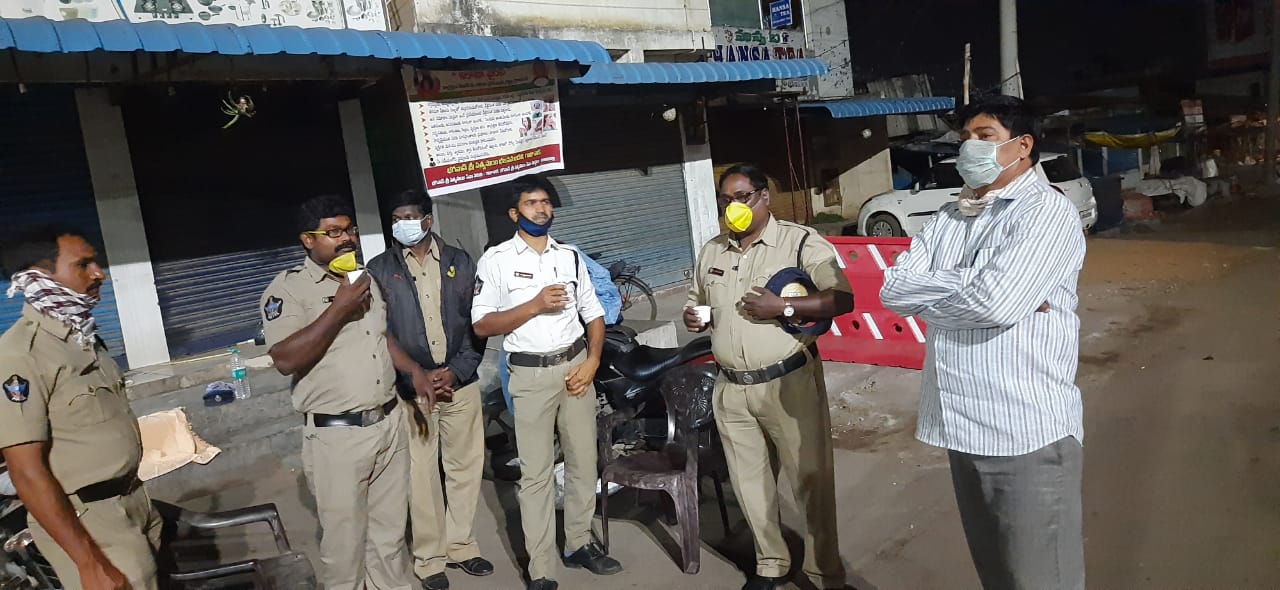 * గాజువాకలో రాత్రి గస్తీ చేసే పోలీసు, సెక్యూరిటీ సిబ్బందికి తేనీటి ఏర్పాట్లు చేస్తున్నారు.
