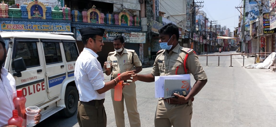 * తెనాలిలో ప్రయాణాల మధ్య ఇక్కట్లపాలైన ప్రయాణీకులకు 100 మందికి భోజన వితరణ చేసారు. పోలీసు వారికి తేనీరు అందజేశారు.
