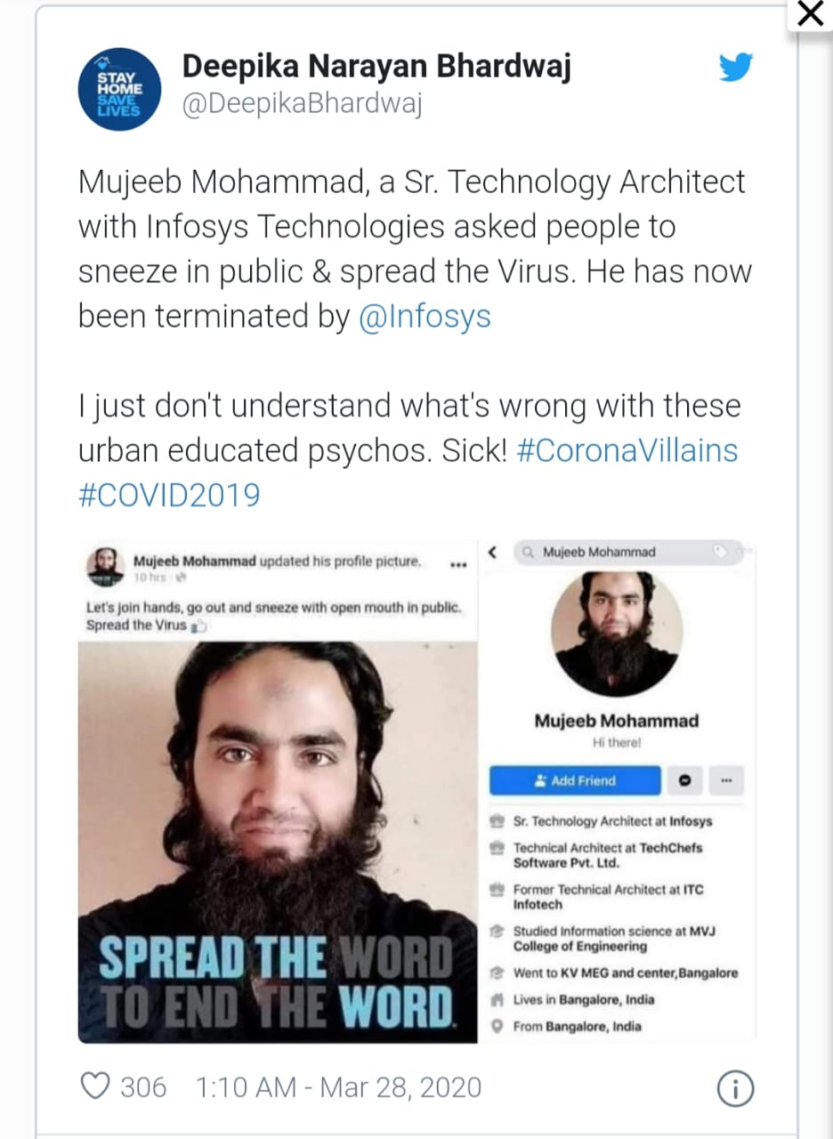 ఇన్ఫోసిస్ లో సీనియర్ టెక్నాలజీ ఆర్కిటెక్ట్గా పనిచేస్తున్న ముజీబ్ మహ్మద్ నిర్వాకమిది. కోవిడ్ -19 కారణంగా నెలకొన్న భయాందోళనల మధ్య ఇతని ట్వీట్ సోషల్ మీడియాలోనూ అతని కార్యాలయంలోనూ అలజడిని సృష్టించింది.
