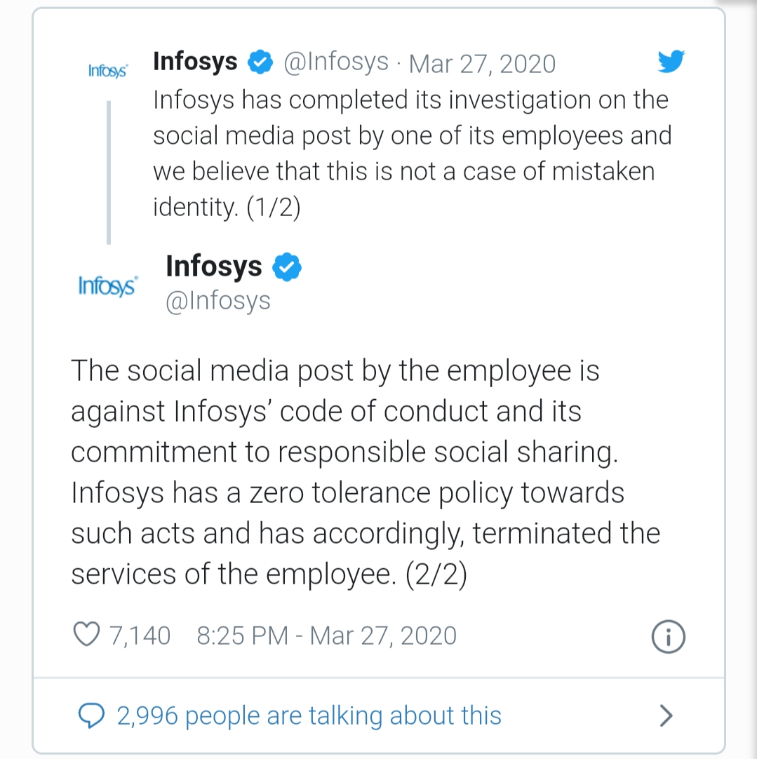 ట్విట్టర్లో ఇన్ఫోసిస్ అధికారిక హ్యాండిల్ ఈ విషయంపై సంస్థ తన దర్యాప్తును పూర్తి చేసిందని, ఉద్యోగి చేసిన పోస్ట్ దాని ప్రవర్తనా నియమావళికి మరియు ‘బాధ్యతాయుతమైన సామాజిక భాగస్వామ్యానికి దాని నిబద్ధతకు’ వ్యతిరేకంగా ఉందని తెలిపింది.