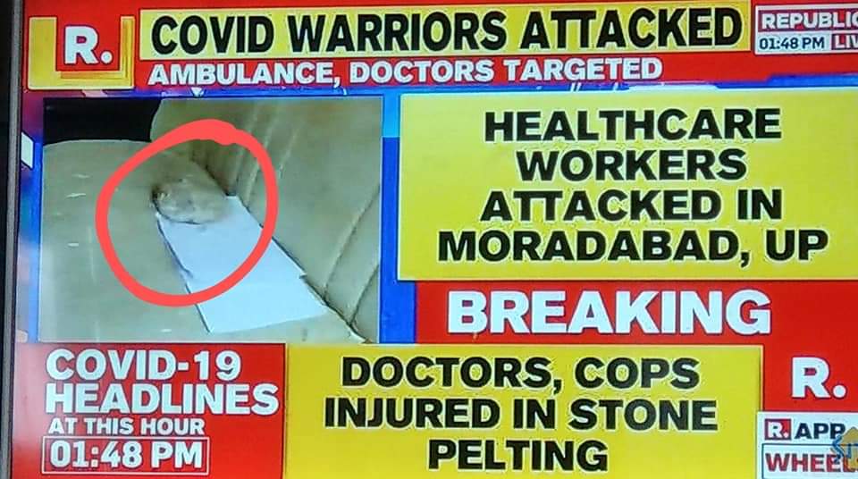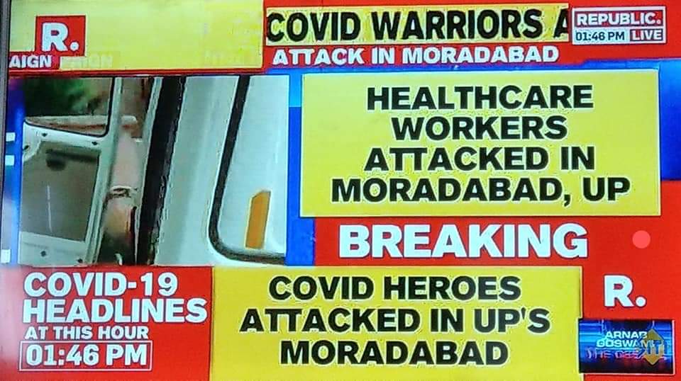 మర్కజ్ కు వెళ్ళి వచ్చిన కరోనా అనుమానితులను క్వారంటాయిన్ కు తరలిస్తున్న డాక్టర్లమీద వైద్య సిబ్బంది మీద మొరాదాబాద్ లో కొందరు వ్యక్తులు రాళ్ళ దాడికి తెగబడ్డారు. “ప్రీ ప్లానెడ్ గా అటాక్ చేశారు” అని అంబులెన్స్ డ్రైవర్ చెప్తున్నారు. ఒక డాక్టర్ తో సహా మరొకరికి తీవ్రంగా గాయాలయ్యాయి. కొంతమంది డాక్టర్లు ఇంకా అక్కడే ఇరుక్కుపోయారని సమాచారం.