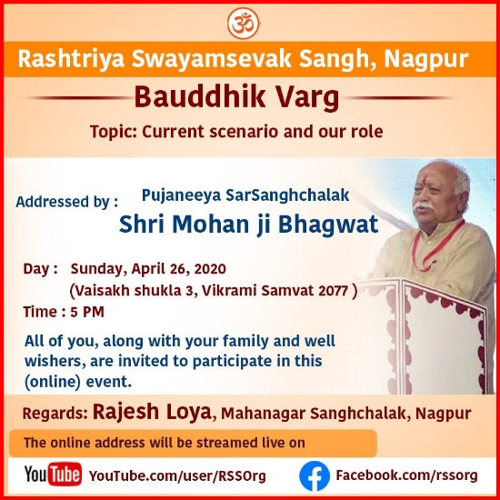 ఆర్ఎస్ఎస్ సర్ సంఘచాలక్ పరమపూజ్యనీయ డాక్టర్ మోహన్ భాగవత్ ఏప్రిల్ 26 న సాయంత్రం 5 గంటలకు “ప్రస్తుత పరిస్థితులలో మన పాత్ర” అనే అంశంపై ఆన్లైన్ లో ప్రసంగిస్తారు, ఇది యూట్యూబ్ మరియు ఫేస్బుక్ లలో ప్రత్యక్ష ప్రసారం చేయబడుతుంది. దానికంటే ముందు కరోనా మహమ్మారికి వ్యతిరేకంగా జాతీయ పోరాటంలో చురుకుగా పాల్గొనవలసినదిగా సర్ కార్యవాహ శ్రీ భయ్యాజీ జోషి స్వయంసేవకులందరికీ విజ్ఞప్తి చేస్తారు.