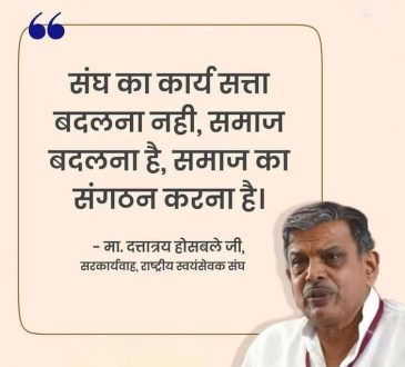 ఆర్‌ఎస్‌ఎస్‌ స‌ర్‌కార్యవాహ‌ దత్తాత్రేయ హోసబలే గొప్ప సమాజం కోసం రాష్ట్రీయ స్వయంసేవక్‌ సంఘం(ఆర్‌ఎస్‌ఎస్‌) పరితపిస్తోందని, సంఘం ఆవిర్భవించినప్పటి నుంచి ఇప్పటి వరకు చేపట్టిన, చేపడుతున్న సేవా కార్యక్రమాలకు సమాజం అమోదముద్ర వేసిందని ఆర్‌ఎస్‌ఎస్‌ స‌ర్‌కార్యవాహ‌ దత్తాత్రేయ హోసబలే అన్నారు. దేశవ్యాప్తంగా 365...